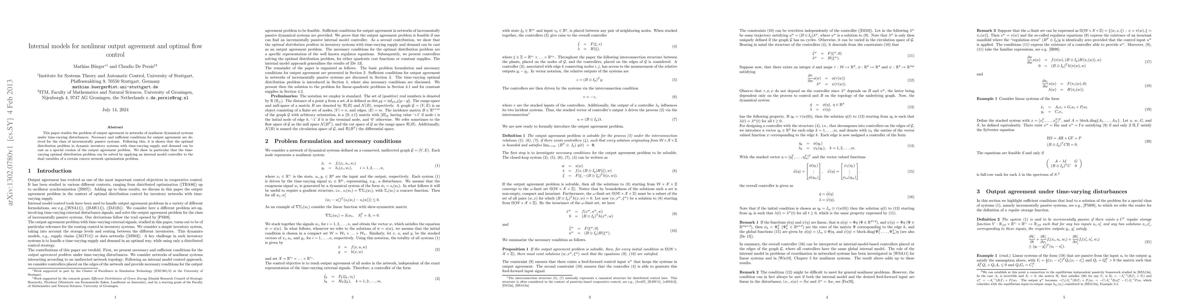 This paper studies the problem of output agreement in networks of nonlinear dynamical systems under time-varying disturbances. Necessary and sufficient conditions for output agreement are derived for the class of incrementally passive systems. Following this, it is shown that the optimal distribution problem in dynamic inventory systems with time-varying supply and demand can be cast as a special version of the output agreement problem. We show in particular that the time-varying optimal distribution problem can be solved by applying an internal model controller to the dual variables of a certain convex network optimization problem.