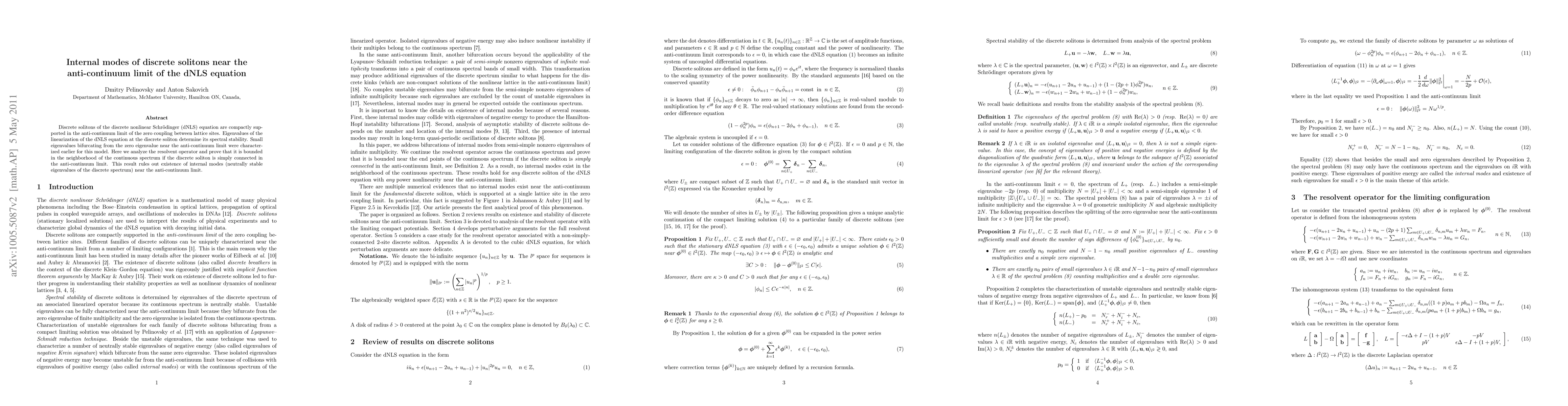 This paper investigates the internal modes of discrete solitons in the dNLS equation near the anti-continuum limit, showing that the resolvent operator is uniformly bounded, thereby proving the absence of internal modes for simply connected solitons. This finding confirms the stability of discrete solitons in this specific limit.