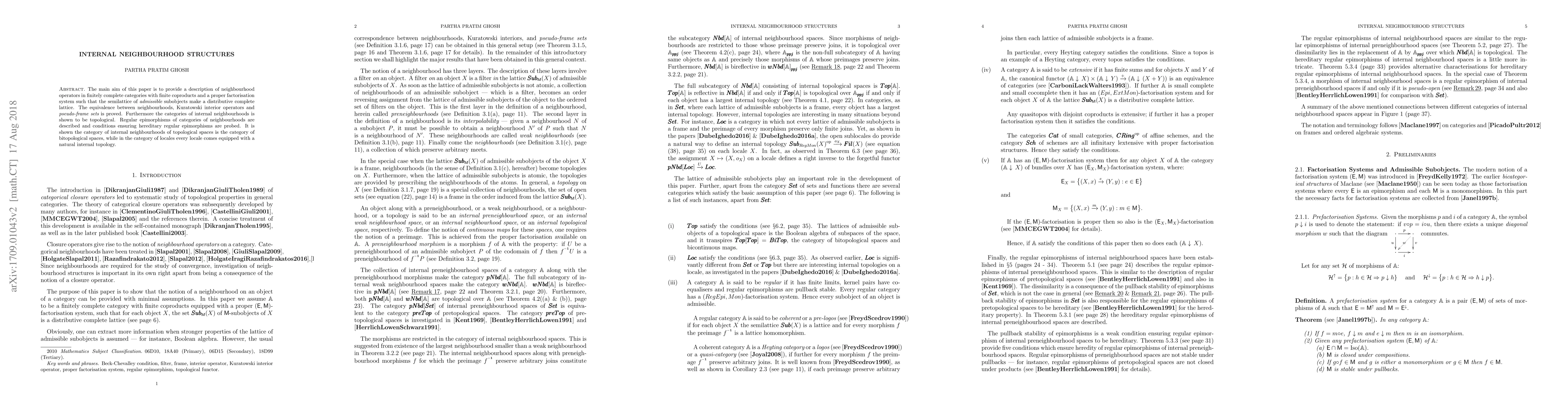 This paper explores the structure of neighbourhood operators in finitely complete categories, proving their equivalence to Kuratowski interior operators and pseudo-frame sets. It demonstrates that the category of internal neighbourhoods is topological and describes regular epimorphisms, including conditions for hereditary regular epimorphisms.