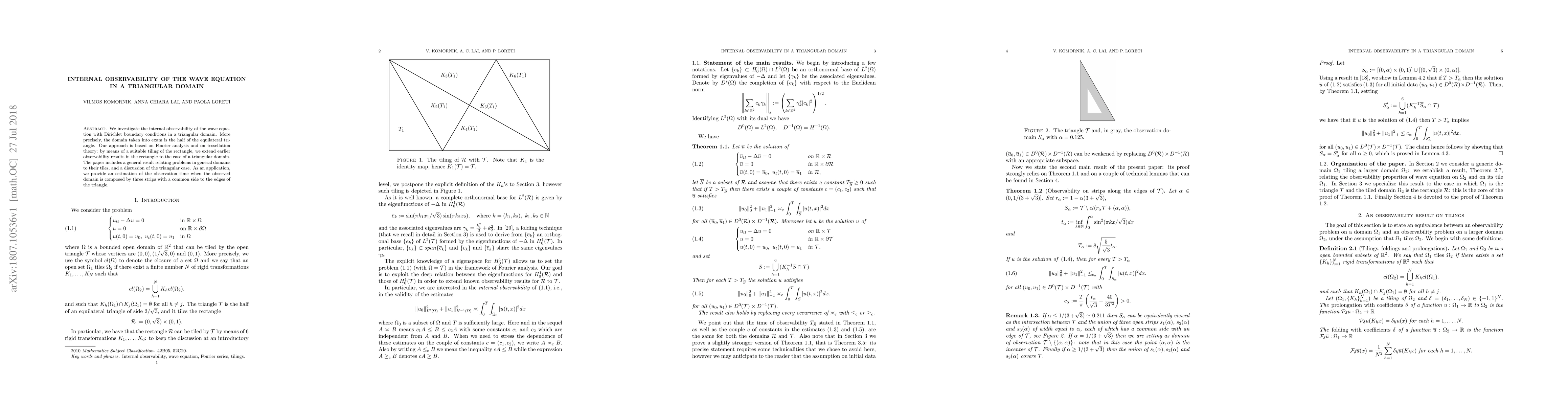 This paper explores the internal observability of the wave equation in a triangular domain using Fourier analysis and tessellation theory. It extends observability results from rectangular domains to triangular domains through a tiling approach, providing an estimation of the observation time for specific observation configurations.