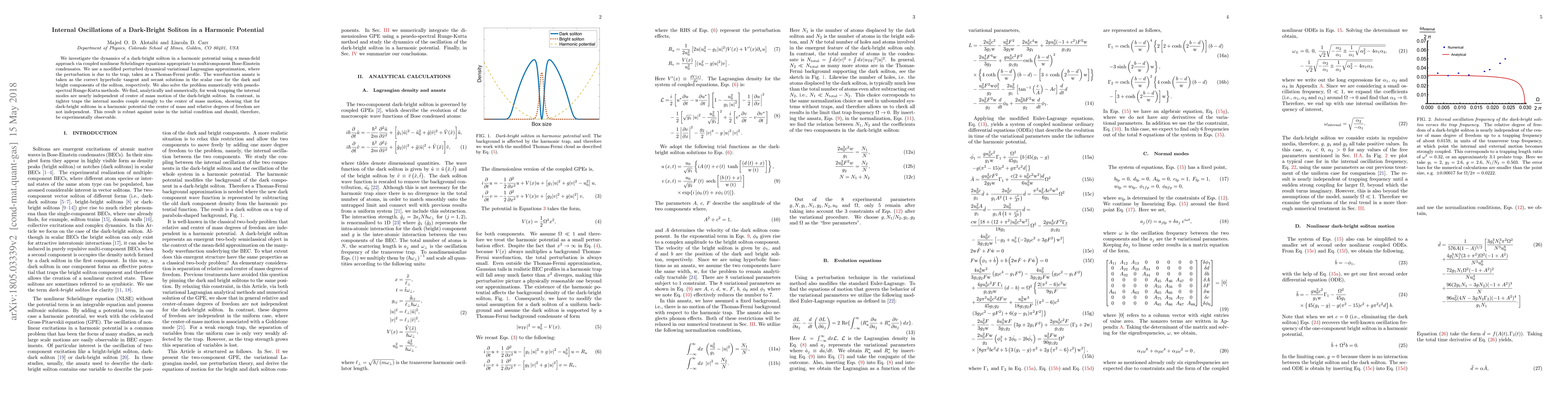 We investigate the dynamics of a dark-bright soliton in a harmonic potential using a mean-field approach via coupled nonlinear Schr\"odinger equations appropriate to multicomponent Bose-Einstein condensates. We use a modified perturbed dynamical variational Lagrangian approximation, where the perturbation is due to the trap, taken as a Thomas-Fermi profile. The wavefunction ansatz is taken as the correct hyperbolic tangent and secant solutions in the scalar case for the dark and bright components of the soliton, respectively. We also solve the problem numerically with psuedo-spectral Runge-Kutta methods. We find, analytically and numerically, for weak trapping the internal modes are nearly independent of center of mass motion of the dark-bright soliton. In contrast, in tighter traps the internal modes couple strongly to the center of mass motion, showing that for dark-bright solitons in a harmonic potential the center of mass and relative degrees of freedom are not independent. This result is robust against noise in the initial condition and should, therefore, be experimentally observable.