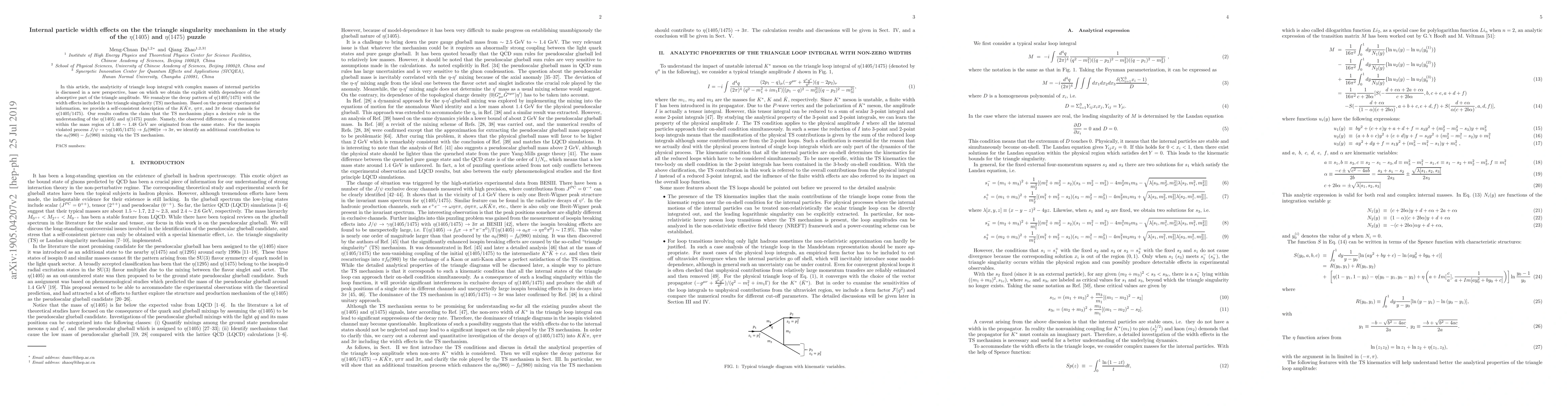 In this article, the analyticity of triangle loop integral with complex masses of internal particles is discussed in a new perspective, base on which we obtain the explicit width dependence of the absorptive part of the triangle amplitude. We reanalyze the decay pattern of $\eta(1405/1475)$ with the width effects included in the triangle singularity (TS) mechanism. Based on the present experimental information, we provide a self-consistent description of the $K\bar{K}\pi$, $\eta\pi\pi$, and $3\pi$ decay channels for $\eta(1405/1475)$. Our results confirm the claim that the TS mechanism plays a decisive role in the understanding of the $\eta(1405)$ and $\eta(1475)$ puzzle. Namely, the observed differences of $\eta$ resonances within the mass region of $1.40\sim 1.48$ GeV are originated from the same state. For the isospin violated process $J/\psi\to\gamma\eta(1405/1475)\to f_0(980)\pi\to 3\pi$, we identify an additional contribution to the $a_0(980)-f_0(980)$ mixing via the TS mechanism.