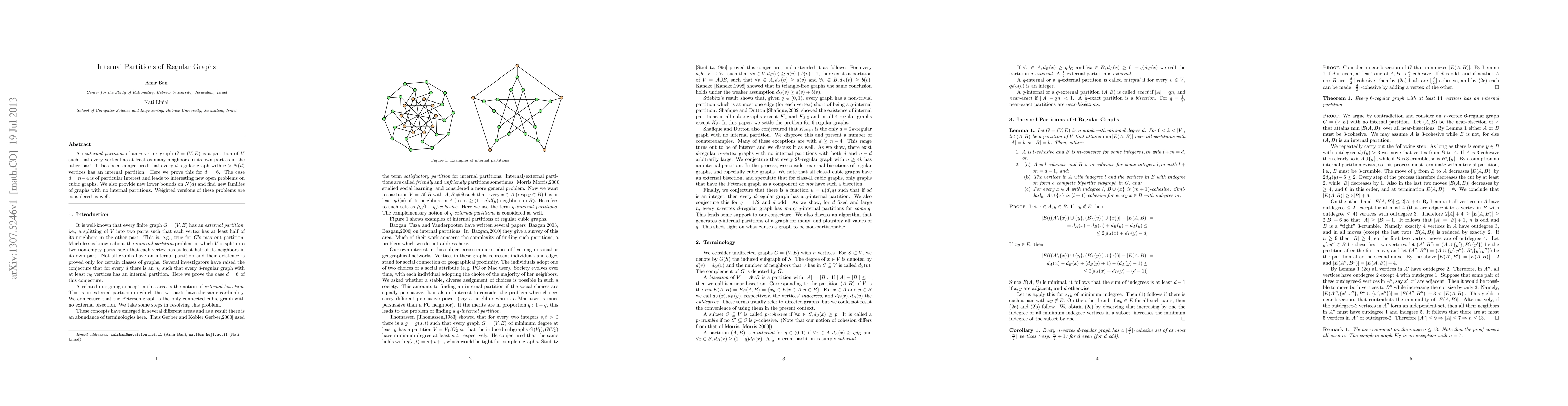 An internal partition of an $n$-vertex graph $G=(V,E)$ is a partition of $V$ such that every vertex has at least as many neighbors in its own part as in the other part. It has been conjectured that every $d$-regular graph with $n>N(d)$ vertices has an internal partition. Here we prove this for $d=6$. The case $d=n-4$ is of particular interest and leads to interesting new open problems on cubic graphs. We also provide new lower bounds on $N(d)$ and find new families of graphs with no internal partitions. Weighted versions of these problems are considered as well.