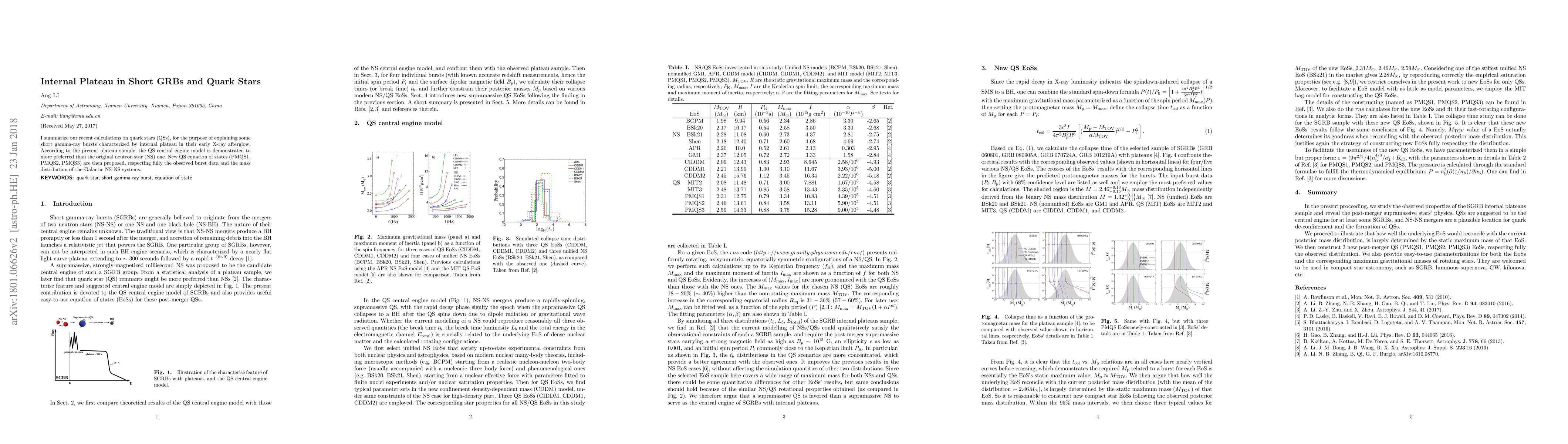 I summarize our recent calculations on quark stars (QSs), for the purpose of explaining some short gamma-ray bursts characterized by internal plateau in their early X-ray afterglow. According to the present plateau sample, the QS central engine model is demonstrated to more preferred than the original neutron star (NS) one. New QS equation of states (PMQS1, PMQS2, PMQS3) are then proposed, respecting fully the observed burst data and the mass distribution of the Galactic NS-NS systems.