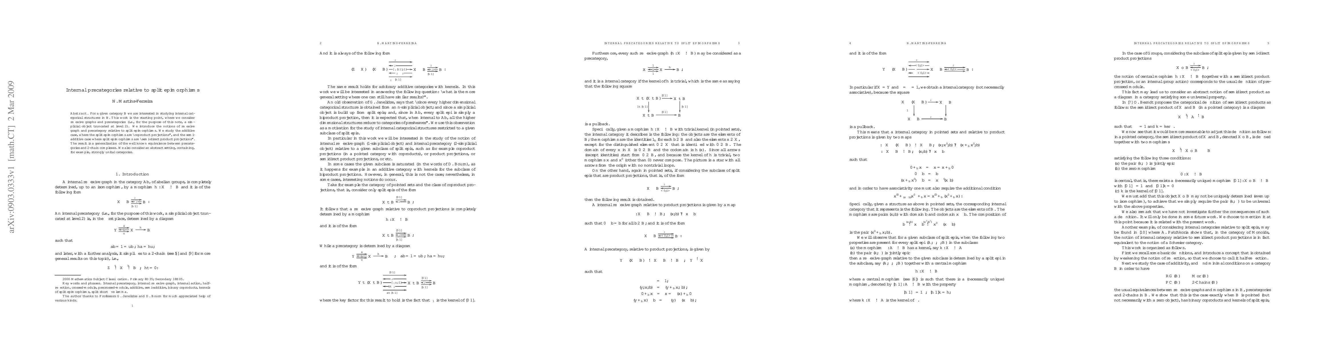 This paper introduces internal precategories within a given category B, focusing on reflexive graphs and structures relative to split epimorphisms. It generalizes the equivalence between precategories and 2-chain complexes, studying both additive and semi-additive cases.