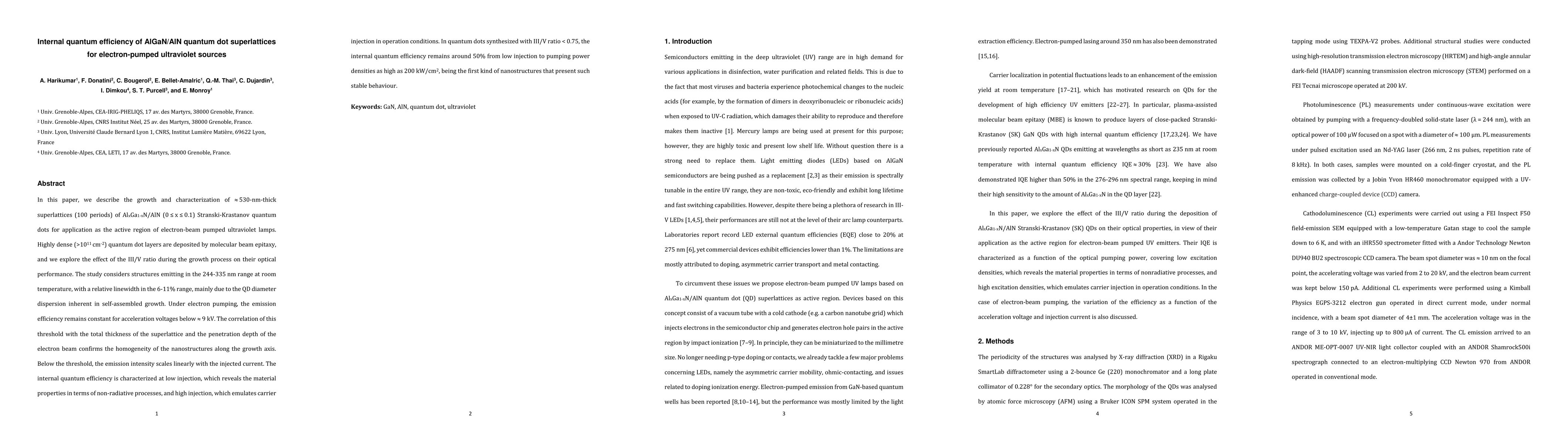 This paper investigates the growth and optical performance of AlGaN/AlN quantum dot superlattices for electron-pumped ultraviolet sources, finding that quantum dots with a III/V ratio < 0.75 maintain an internal quantum efficiency of around 50% under high pumping power densities, demonstrating stable emission efficiency.