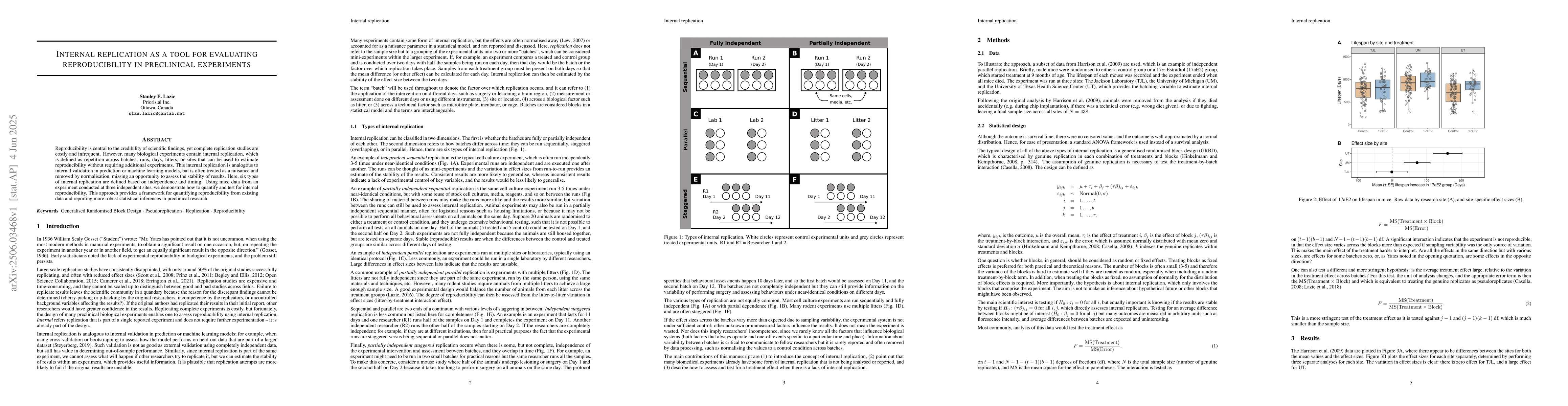 The paper proposes using internal replication, repetition across various factors in preclinical experiments, to estimate reproducibility without additional experiments, defining six types based on independence and timing, and demonstrating this approach with mice data from three independent sites.