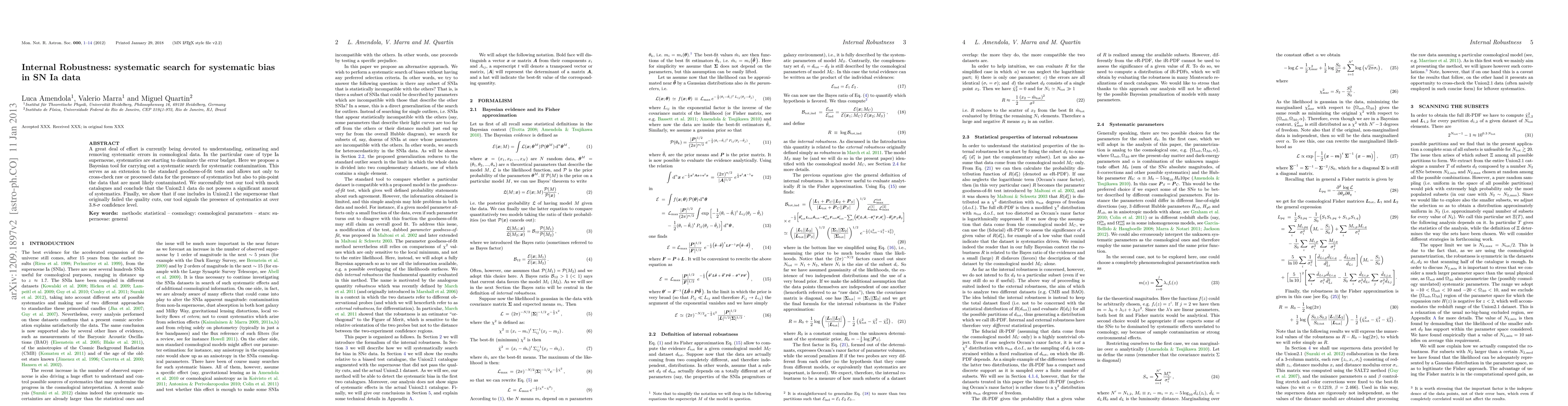 A great deal of effort is currently being devoted to understanding, estimating and removing systematic errors in cosmological data. In the particular case of type Ia supernovae, systematics are starting to dominate the error budget. Here we propose a Bayesian tool for carrying out a systematic search for systematic contamination. This serves as an extension to the standard goodness-of-fit tests and allows not only to cross-check raw or processed data for the presence of systematics but also to pin-point the data that are most likely contaminated. We successfully test our tool with mock catalogues and conclude that the Union2.1 data do not possess a significant amount of systematics. Finally, we show that if one includes in Union2.1 the supernovae that originally failed the quality cuts, our tool signals the presence of systematics at over 3.8-sigma confidence level.