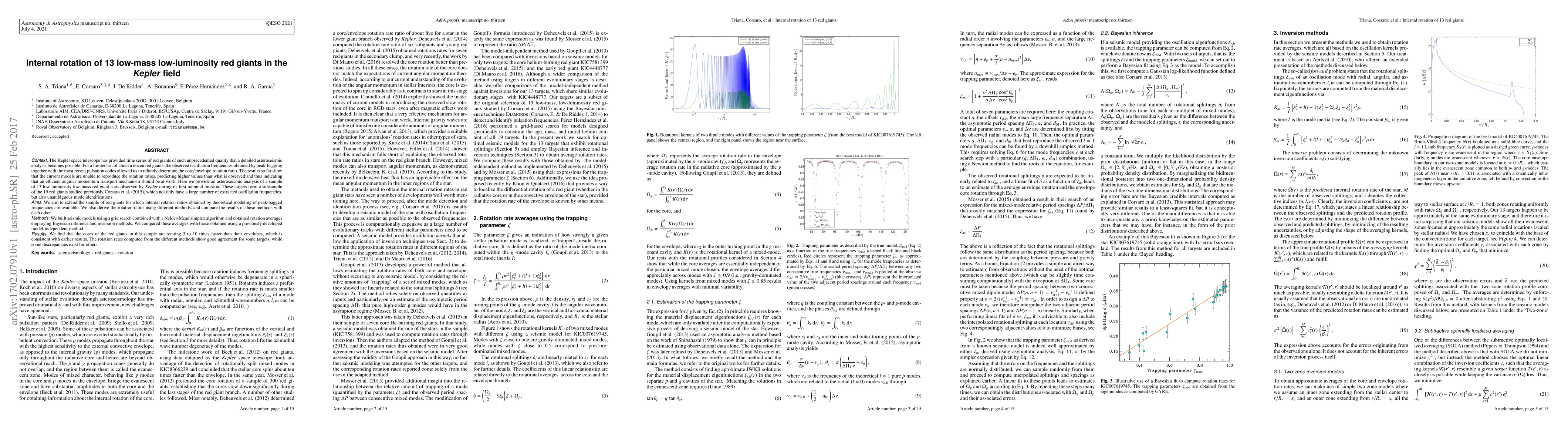 The Kepler space telescope has provided time series of red giants of such unprecedented quality that a detailed asteroseismic analysis becomes possible. For a limited set of about a dozen red giants, the observed oscillation frequencies obtained by peak-bagging together with the most recent pulsation codes allowed us to reliably determine the core/envelope rotation ratio. The results so far show that the current models are unable to reproduce the rotation ratios, predicting higher values than what is observed and thus indicating that an efficient angular momentum transport mechanism should be at work. Here we provide an asteroseismic analysis of a sample of 13 low-luminosity low-mass red giant stars observed by Kepler during its first nominal mission. These targets form a subsample of the 19 red giants studied previously Corsaro et al. 2015, which not only have a large number of extracted oscillation frequencies, but also unambiguous mode identifications We aim to extend the sample of red giants for which internal rotation ratios obtained by theoretical modeling of peak-bagged frequencies are available. We also derive the rotation ratios using different methods, and compare the results of these methods with each other. We built seismic models using a grid search combined with a Nelder-Mead simplex algorithm and obtained rotation averages employing Bayesian inference and inversion methods. We compared these averages with those obtained using a previously developed model-independent method. We find that the cores of the red giants in this sample are rotating 5 to 10 times faster than their envelopes, which is consistent with earlier results. The rotation rates computed from the different methods show good agreement for some targets, while some discrepancies exist for others.
