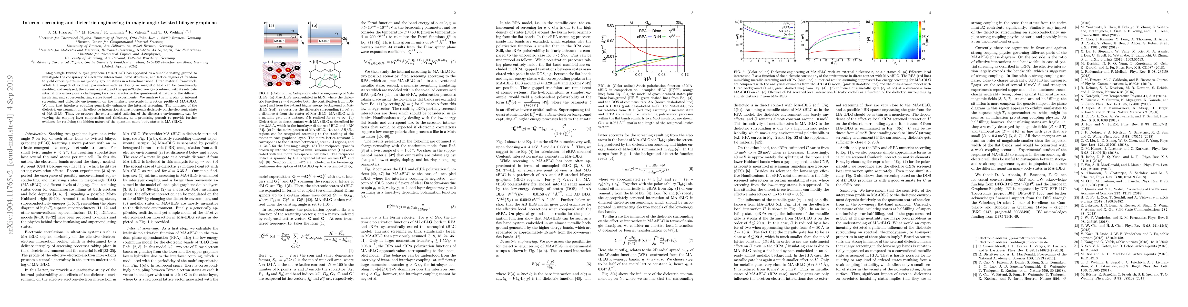 This paper investigates the role of internal screening and dielectric engineering in magic-angle twisted bilayer graphene (MA-tBLG), revealing that interlayer coupling enhances internal screening. The study suggests that tailoring the dielectric environment could provide further insights into the quantum many-body states in MA-tBLG.