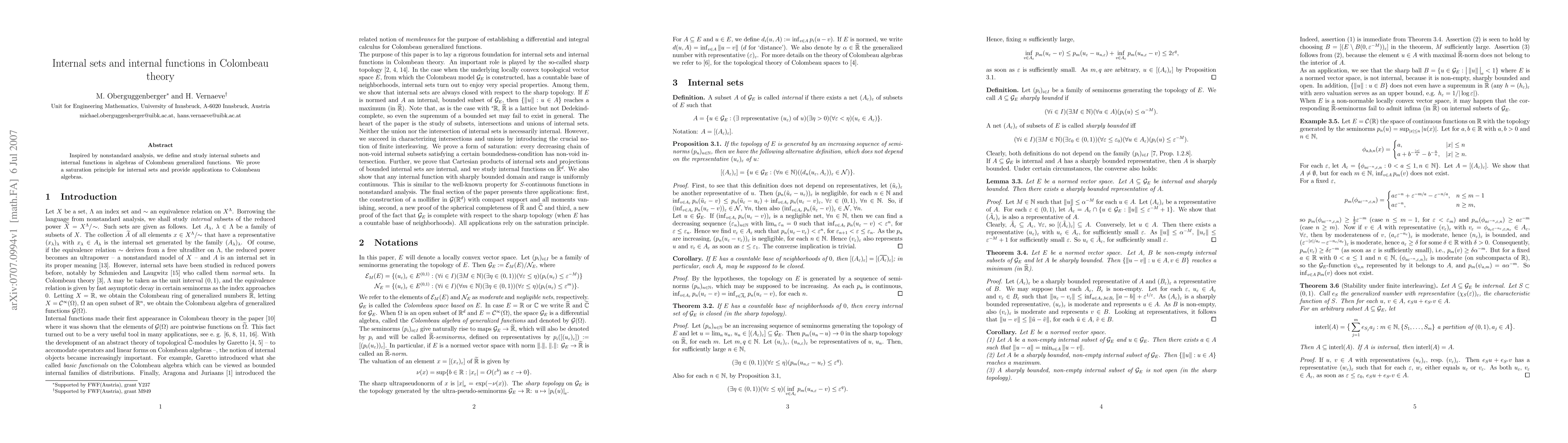 This research contributes to the foundational understanding of Colombeau's theory of generalized functions by providing a framework for internal sets and functions, which can enhance the applicability of Colombeau algebras in various mathematical contexts, including distribution theory and partial differential equations.