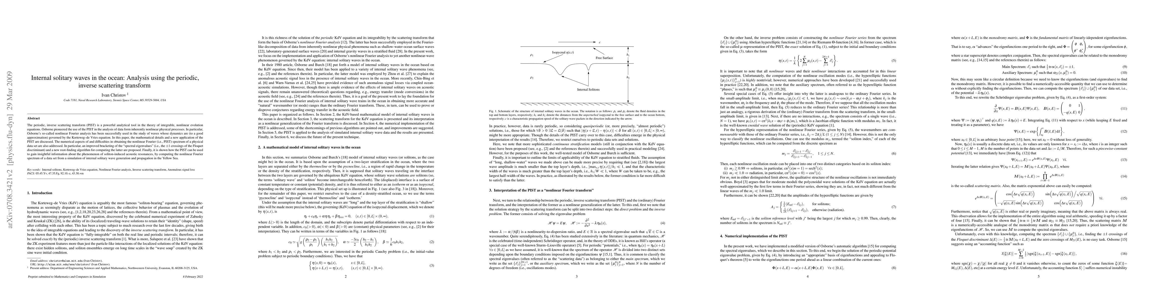 The periodic, inverse scattering transform (PIST) is a powerful analytical tool in the theory of integrable, nonlinear evolution equations. Osborne pioneered the use of the PIST in the analysis of data form inherently nonlinear physical processes. In particular, Osborne's so-called nonlinear Fourier analysis has been successfully used in the study of waves whose dynamics are (to a good approximation) governed by the Korteweg--de Vries equation. In this paper, the mathematical details and a new application of the PIST are discussed. The numerical aspects of and difficulties in obtaining the nonlinear Fourier (i.e., PIST) spectrum of a physical data set are also addressed. In particular, an improved bracketing of the "spectral eigenvalues" (i.e., the +/-1 crossings of the Floquet discriminant) and a new root-finding algorithm for computing the latter are proposed. Finally, it is shown how the PIST can be used to gain insightful information about the phenomenon of soliton-induced acoustic resonances, by computing the nonlinear Fourier spectrum of a data set from a simulation of internal solitary wave generation and propagation in the Yellow Sea.