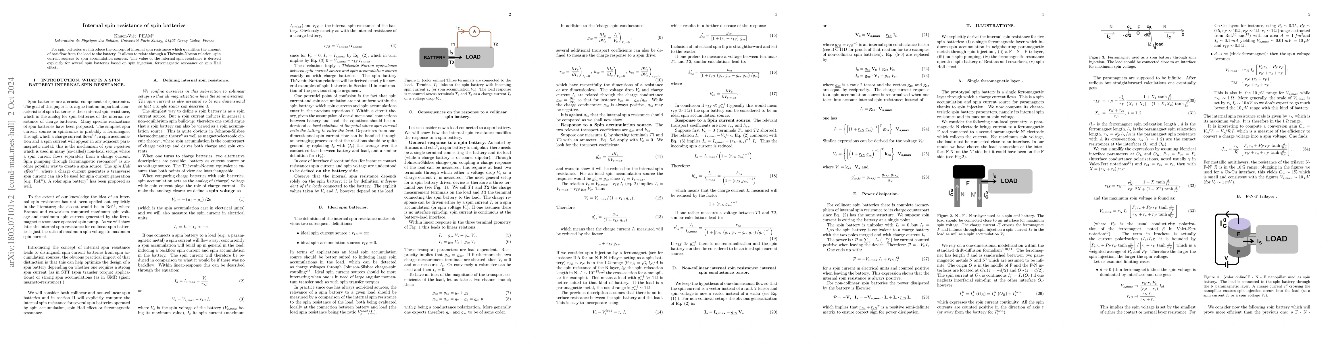 This paper introduces the concept of internal spin resistance for spin batteries, quantifying the backflow from the load to the battery. It derives this resistance explicitly for various spin battery types, relating spin current sources to spin accumulation sources via a Thevenin-Norton equivalence.