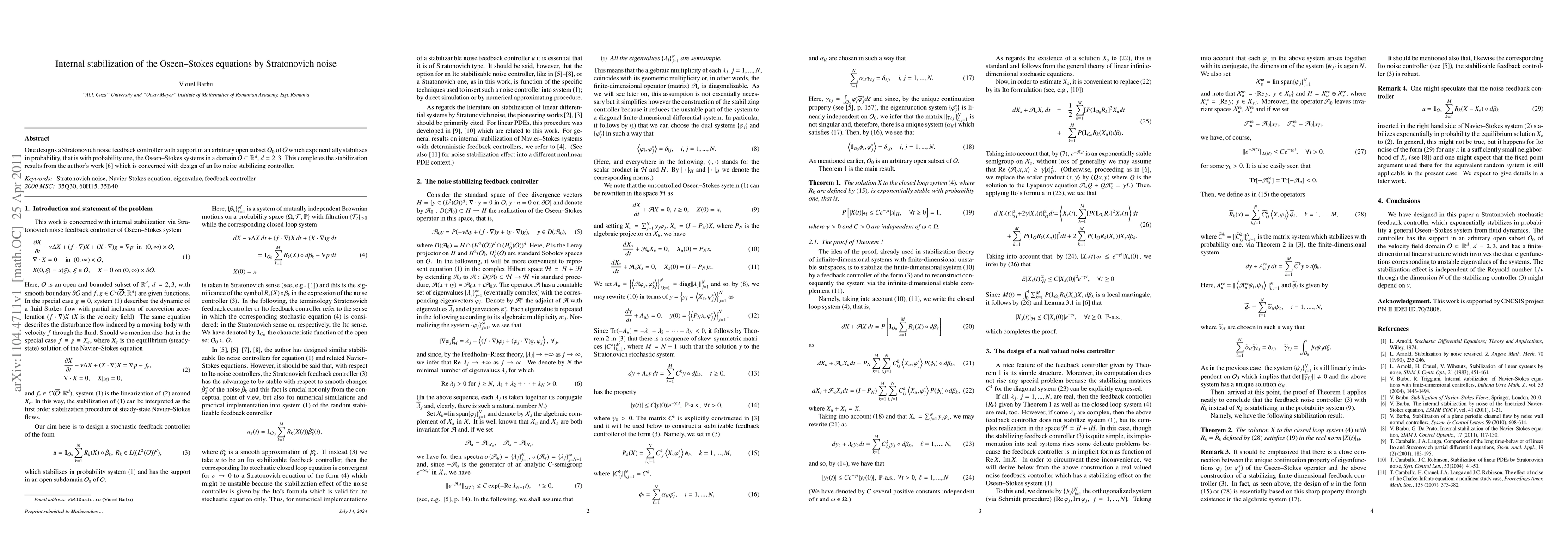 Summary: This paper proposes an internal Stratonovich noise feedback controller that exponentially stabilizes steady state solutions to the Oseen-Stokes equations, enhancing system stability through stochastic control methods.