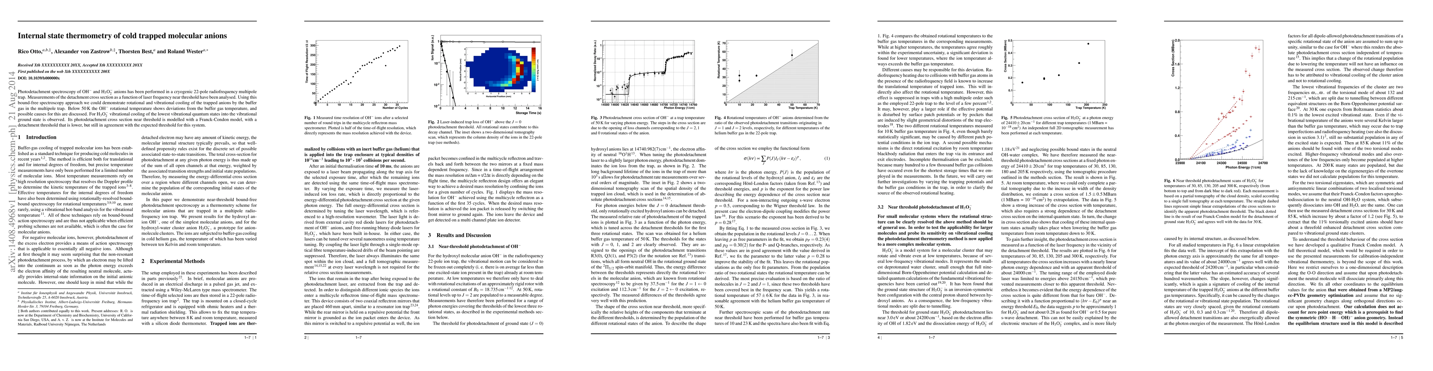 This paper reports on the use of photodetachment spectroscopy to study the internal state thermometry of cold trapped molecular anions, specifically OH- and H3O2-. The study shows rotational and vibrational cooling of the anions in a cryogenic multipole trap, with deviations in OH- rotational temperature below 50 K and vibrational cooling in H3O2- into its ground state.