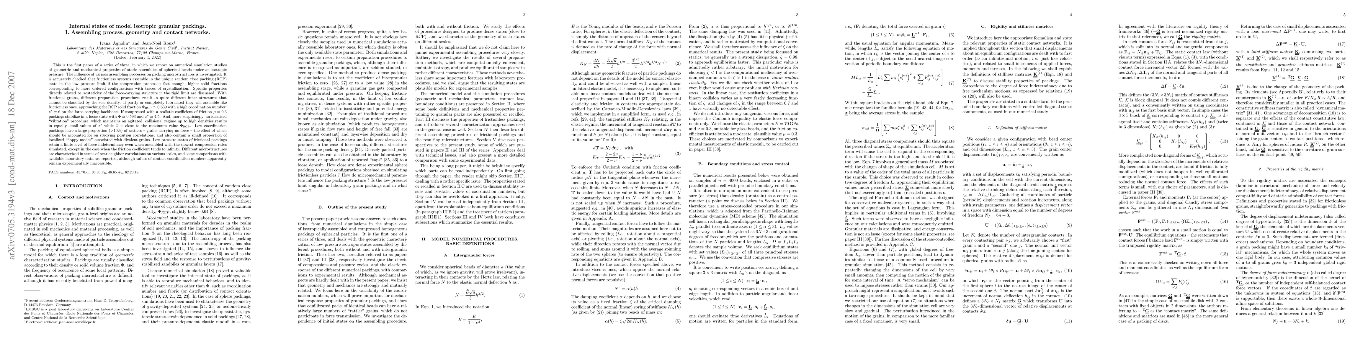 This is the first paper of a series of three, reporting on numerical simulation studies of geometric and mechanical properties of static assemblies of spherical beads under an isotropic pressure. Frictionless systems assemble in the unique random close packing (RCP) state in the low pressure limit if the compression process is fast enough, slower processes inducing traces of crystallization, and exhibit specific properties directly related to isostaticity of the force-carrying structure. The different structures of frictional packings assembled by various methods cannot be classified by the sole density. While lubricated systems approach RCP densities and coordination number z^*~=6 on the backbone in the rigid limit, an idealized "vibration" procedure results in equally dense configurations with z^*~=4.5. Near neighbor correlations on various scales are computed and compared to available laboratory data, although z^* values remain experimentally inaccessible. Low coordination packings have many rattlers (more than 10% of the grains carry no force), which should be accounted for on studying position correlations, and a small proportion of harmless "floppy modes" associated with divalent grains. Frictional packings, however slowly assembled under low pressure, retain a finite level of force indeterminacy, except in the limit of infinite friction.