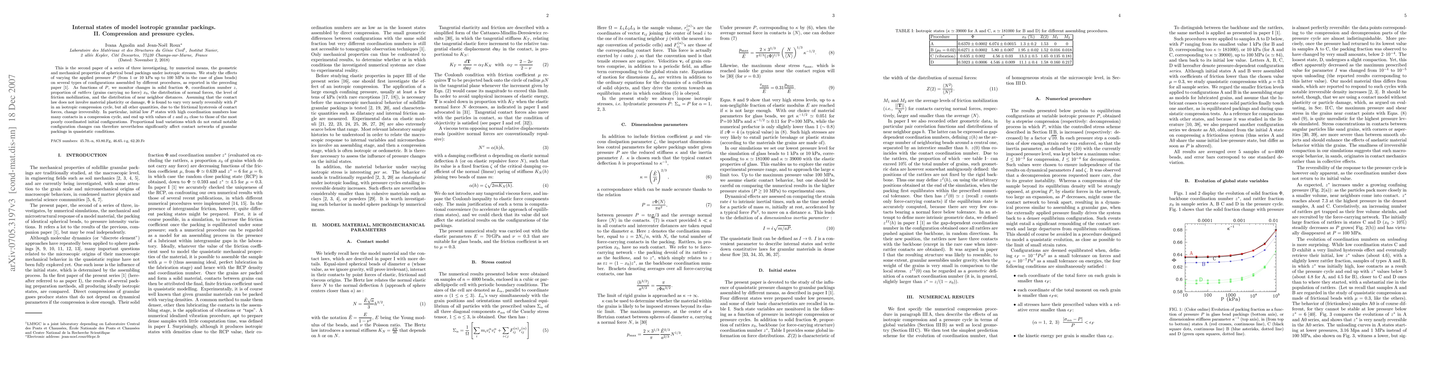 This is the second paper of a series of three investigating, by numerical means, the geometric and mechanical properties of spherical bead packings under isotropic stresses. We study the effects of varying the applied pressure P (from 1 or 10 kPa up to 100 MPa in the case of glass beads) on several types of configurations assembled by different procedures, as reported in the preceding paper. As functions of P, we monitor changes in solid fraction \Phi, coordination number z, proportion of rattlers (grains carrying no force) x0, the distribution of normal forces, the level of friction mobilization, and the distribution of near neighbor distances. Assuming the contact law does not involve material plasticity or damage, \Phi is found to vary very nearly reversibly with P in an isotropic compression cycle, but all other quantities, due to the frictional hysteresis of contact forces, change irreversibly. In particular, initial low P states with high coordination numbers lose many contacts in a compression cycle, and end up with values of z and x0 close to those of the most poorly coordinated initial configurations. Proportional load variations which do not entail notable configuration changes can therefore nevertheless significantly affect contact networks of granular packings in quasistatic conditions.
