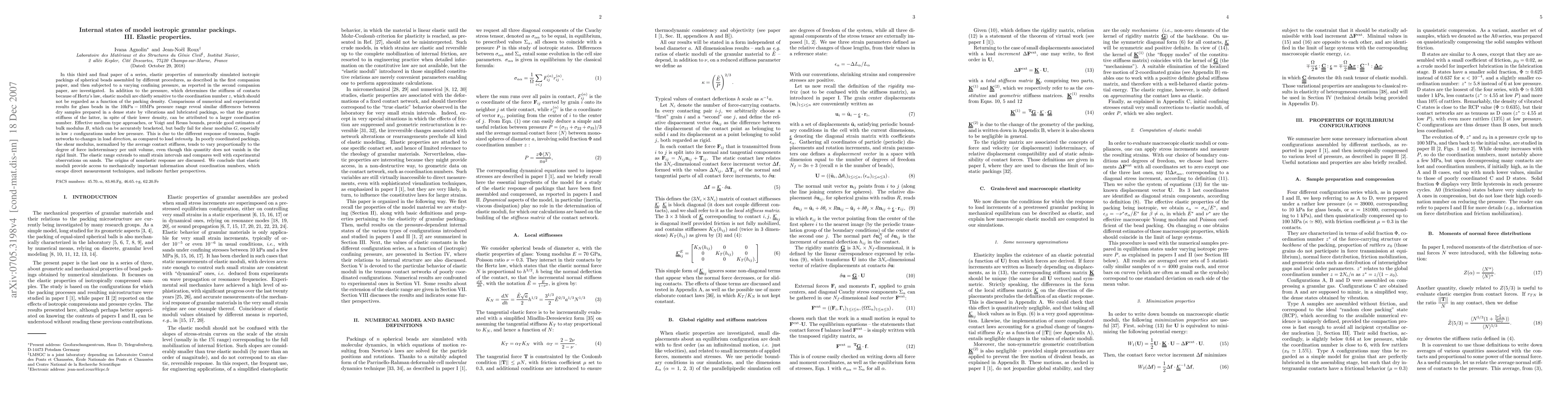 In this third and final paper of a series, elastic properties of numerically simulated isotropic packings of spherical beads assembled by different procedures and subjected to a varying confining pressure P are investigated. In addition P, which determines the stiffness of contacts by Hertz's law, elastic moduli are chiefly sensitive to the coordination number, the possible values of which are not necessarily correlated with the density. Comparisons of numerical and experimental results for glass beads in the 10kPa-10MPa range reveal similar differences between dry samples compacted by vibrations and lubricated packings. The greater stiffness of the latter, in spite of their lower density, can hence be attributed to a larger coordination number. Voigt and Reuss bounds bracket bulk modulus B accurately, but simple estimation schemes fail for shear modulus G, especially in poorly coordinated configurations under low P. Tenuous, fragile networks respond differently to changes in load direction, as compared to load intensity. The shear modulus, in poorly coordinated packings, tends to vary proportionally to the degree of force indeterminacy per unit volume. The elastic range extends to small strain intervals, in agreement with experimental observations. The origins of nonelastic response are discussed. We conclude that elastic moduli provide access to mechanically important information about coordination numbers, which escape direct measurement techniques, and indicate further perspectives.
