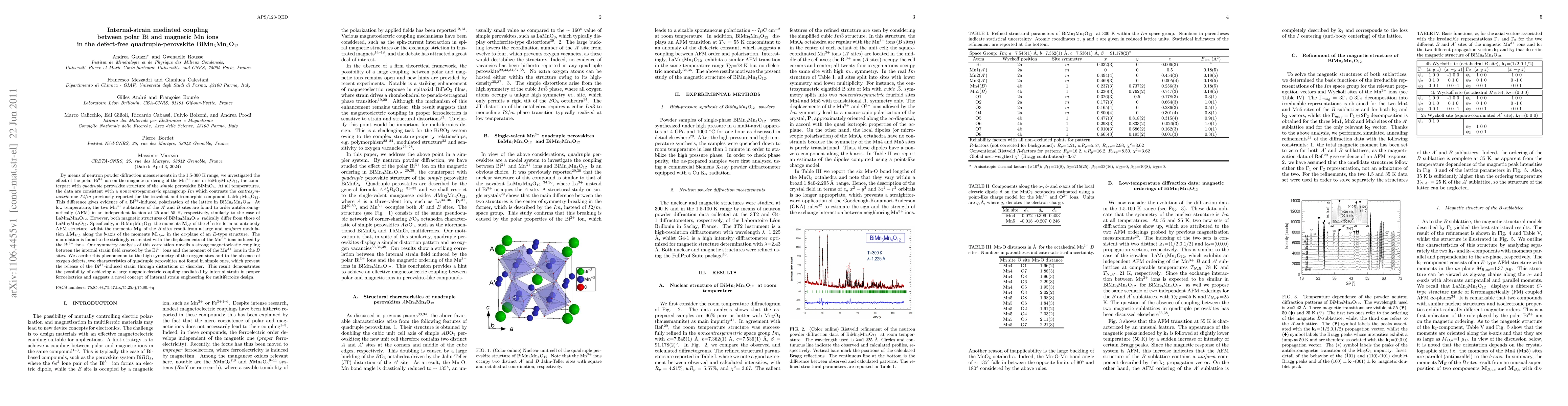 This paper investigates the magnetoelastic coupling in the defect-free quadruple perovskite BiMn$_3$Mn$_4$O$_{12}$, revealing a strong interaction between the internal strain from polar Bi$^{3+}$ ions and the magnetic ordering of Mn$^{3+}$ ions. The study highlights a unique magnetoelectric coupling mechanism, suggesting potential for advanced multiferroic material design.