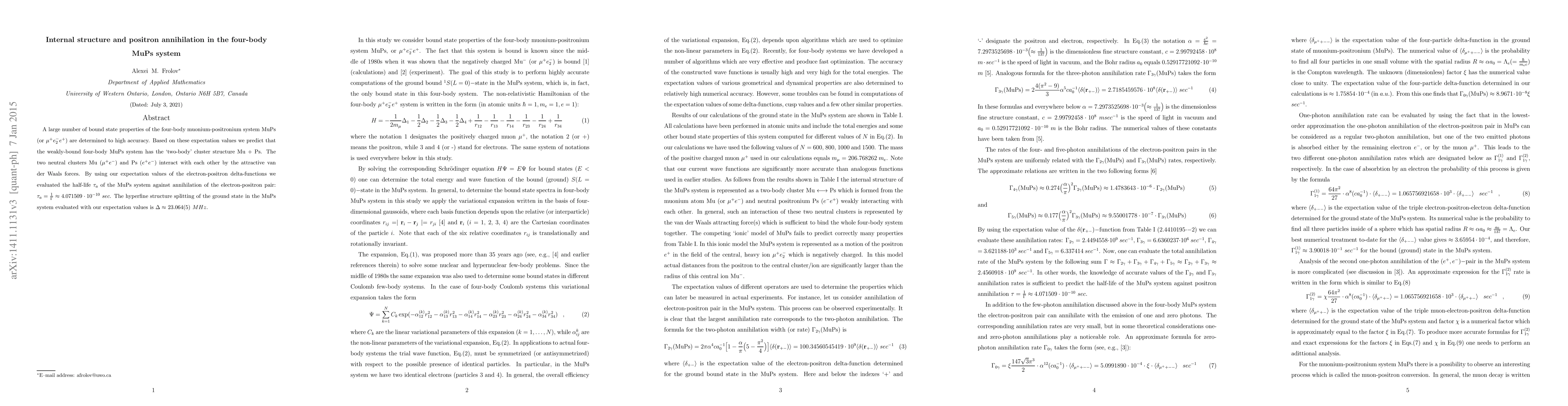 This paper determines the internal structure and annihilation properties of the four-body MuPs system, predicting a "two-body" cluster structure of Mu ($\mu^{+} e^{-}$) and Ps ($e^{+} e^{-}$) held together by van der Waals forces. The calculated half-life for MuPs annihilation is approximately $4.071509 \times 10^{-10}$ seconds, and the ground state hyperfine structure splitting is $23.064(5)$ MHz.