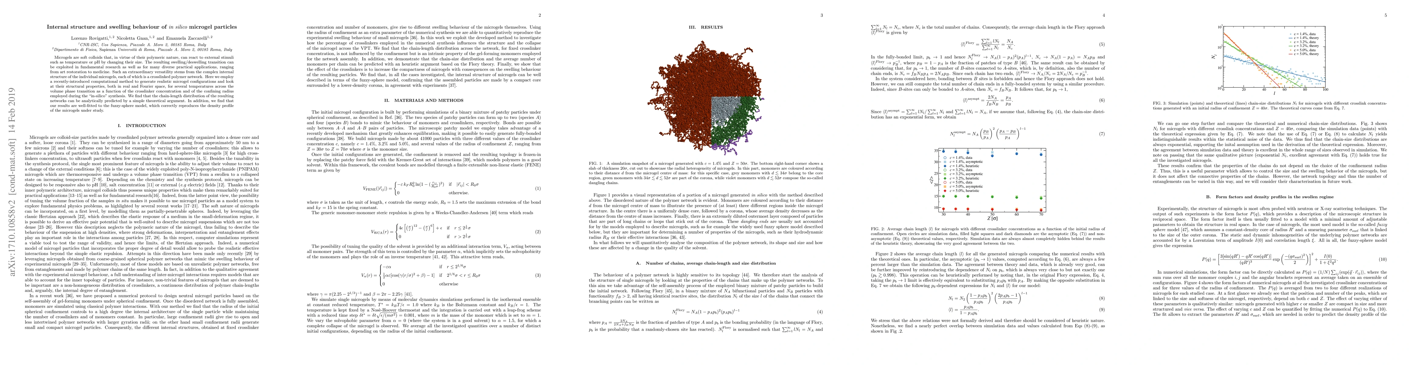 Microgels are soft colloids that, in virtue of their polymeric nature, can react to external stimuli such as temperature or pH by changing their size. The resulting swelling/deswelling transition can be exploited in fundamental research as well as for many diverse practical applications, ranging from art restoration to medicine. Such an extraordinary versatility stems from the complex internal structure of the individual microgels, each of which is a crosslinked polymer network. Here we employ a recently-introduced computational method to generate realistic microgel configurations and look at their structural properties, both in real and Fourier space, for several temperatures across the volume phase transition as a function of the crosslinker concentration and of the confining radius employed during the `in-silico' synthesis. We find that the chain-length distribution of the resulting networks can be analytically predicted by a simple theoretical argument. In addition, we find that our results are well-fitted to the fuzzy-sphere model, which correctly reproduces the density profile of the microgels under study.