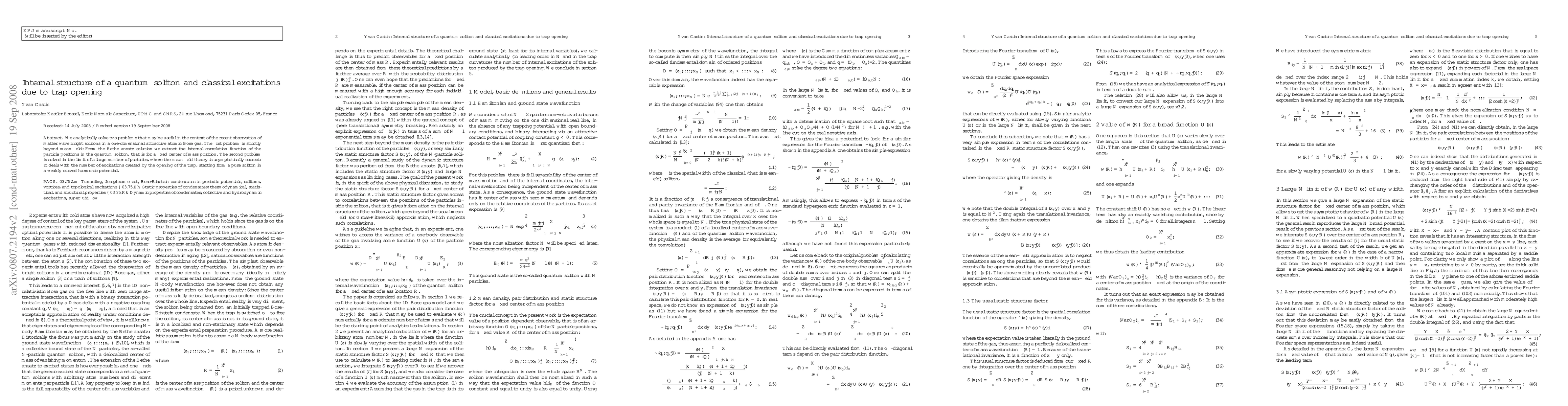 This paper analytically investigates the internal structure of quantum solitons in a one-dimensional attractive Bose gas, deriving the internal correlation function from the Bethe ansatz solution. It also examines classical excitations generated when the trap is opened, starting from a pure soliton in a weakly curved harmonic potential.