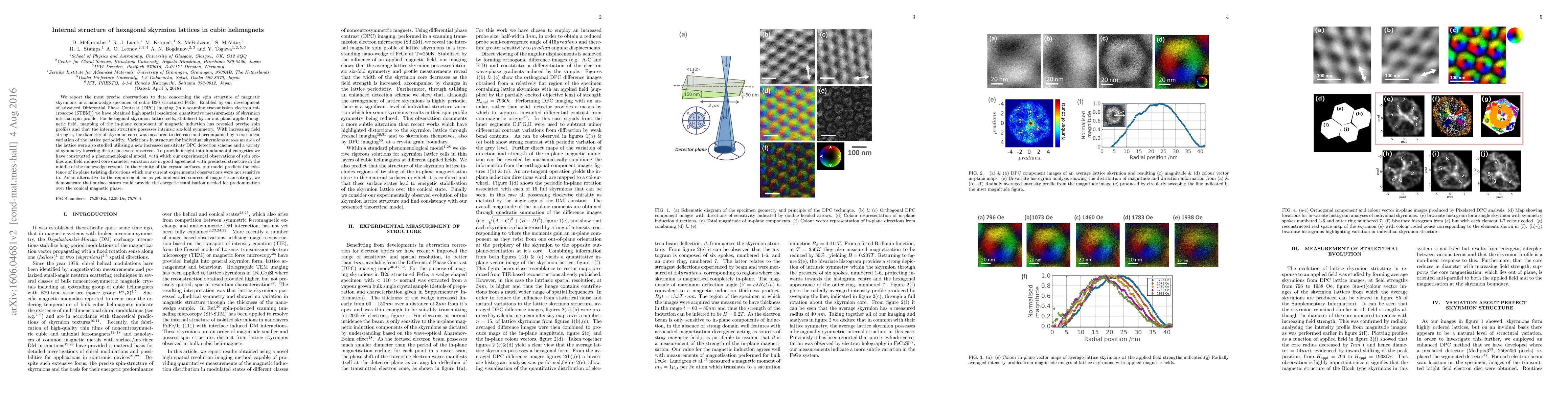 We have utilised a high spatial resolution imaging method, Differential Phase Contrast (DPC) performed in a scanning transmission electron microscope (STEM), for precise measurement of the magnetic induction distribution in skyrmion states in noncentrosymmetric magnetically ordered materials. Applied to investigate the internal structure of hexagonal skyrmion lattice cells, stabilised by an out-plane applied magnetic field in an FeGe nanowedge specimen, mapping of the in-plane component of magnetic induction has yielded "average" skyrmion profiles and observation of internal six-fold symmetry. With increasing field strength, the diameter of "average" skyrmion cores was observed to decrease accompanied by a non-linear variation of the lattice periodicity. Variations in structure for individual skyrmions were studied utilising an advanced DPC detection scheme with a variety of symmetry lowering distortions being observed. Our observations are consistent with a theoretical phenomenological model, which has predicted the structure of hexagonal skyrmion lattice cells and also that twisting states near to the material surfaces provide a basis for energetic stabilisation of the skyrmion lattice over the conical phase. There was good agreement with experiment for predictions of bulk skyrmion structure and their response (core-size & lattice periodicity variation) to an applied field.