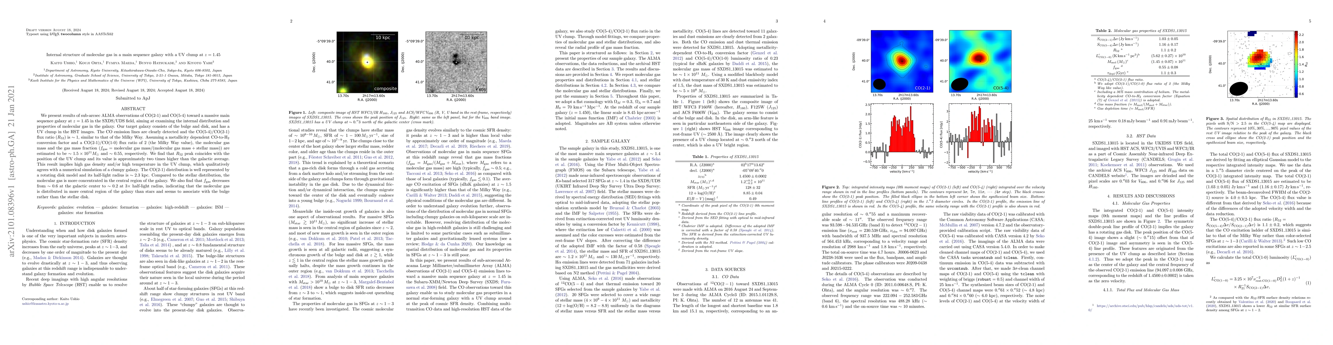 We present results of sub-arcsec ALMA observations of CO(2-1) and CO(5-4) toward a massive main sequence galaxy at z = 1.45 in the SXDS/UDS field, aiming at examining the internal distribution and properties of molecular gas in the galaxy. Our target galaxy consists of the bulge and disk, and has a UV clump in the HST images. The CO emission lines are clearly detected and the CO(5-4)/CO(2-1) flux ratio (R_52) is ~1, similar to that of the Milky Way. Assuming a metallicity dependent CO-toH_2 conversion factor and a CO(2-1)/CO(1-0) flux ratio of 2 (the Milky Way value), the molecular gas mass and the gas mass fraction (f_gas = molecular gas mass / (molecular gas mass + stellar mass)) are estimated to be ~1.5x10^11 M_Sun and ~0.55, respectively. We find that R_52 peak coincides with the position of the UV clump and its value is approximately two times higher than the galactic average. This result implies high gas density and/or high temperature in the UV clump, which qualitatively agrees with a numerical simulation of a clumpy galaxy. The CO(2-1) distribution is well represented by a rotating disk model and its half-light radius is ~2.3 kpc. Compared to the stellar distribution, the molecular gas is more concentrated in the central region of the galaxy. We also find that f_gas decreases from ~0.6 at the galactic center to ~0.2 at 3xhalf-light radius, indicating that the molecular gas is distributed in more central region of the galaxy than stars and seems to associate with the bulge rather than the stellar disk.