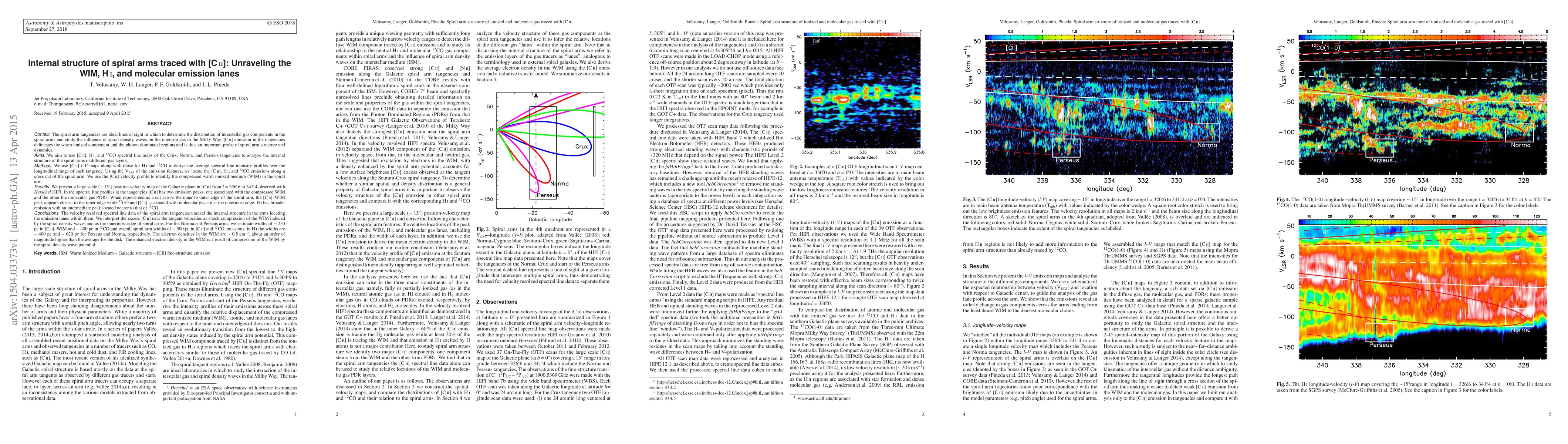 The spiral arm tangencies are ideal lines of sight in which to determine the distribution of interstellar gas components in the spiral arms and study the influence of spiral density waves on the interarm gas in the Milky Way. We present a large scale (~15deg) position-velocity map of the Galactic plane in [CII] from l = 326.6 to 341.4deg observed with Herschel HIFI. We use [CII] l-v maps along with those for Hi and 12CO to derive the average spectral line intensity profiles over the longitudinal range of each tangency. Using the VLSR of the emission features, we locate the [CII], HI, and 12CO emissions along a cross cut of the spiral arm. In the spectral line profiles at the tangencies [CII] has two emission peaks, one associated with the compressed WIM and the other the molecular gas PDRs. When represented as a cut across the inner to outer edge of the spiral arm, the [CII]-WIM peak appears closest to the inner edge while 12CO and [CII] associated with molecular gas are at the outermost edge. HI has broader emission with an intermediate peak located nearer to that of 12CO. The velocity resolved spectral line data of the spiral arm tangencies unravel the internal structure in the arms locating the emission lanes within them. We interpret the excess [CII] near the tangent velocities as shock compression of the WIM induced by the spiral density waves and as the innermost edge of spiral arms. For the Norma and Perseus arms, we estimate widths of ~250 pc in [CII]-WIM and ~400 pc in 12CO and overall spiral arm widths of ~500 pc in [CII] and 12CO emissions. The electron densities in the WIM are ~ 0.5 cm^-3, about an order of magnitude higher than the average for the disk. The enhanced electron density in the WIM is a result of compression of the WIM by the spiral density wave potential.