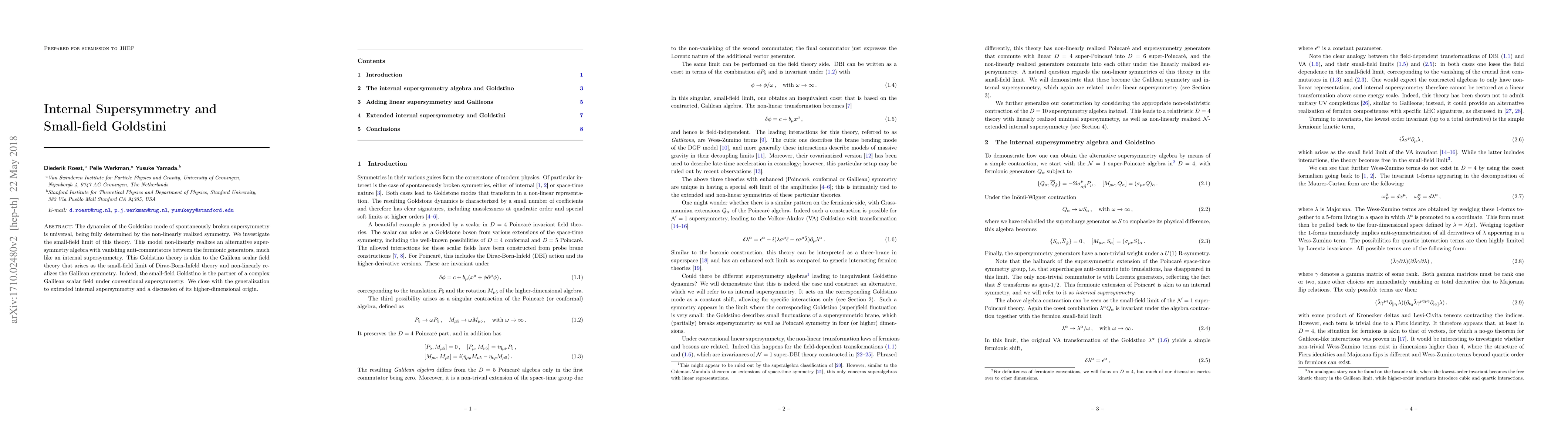 The dynamics of the Goldstino mode of spontaneously broken supersymmetry is universal, being fully determined by the non-linearly realized symmetry. We investigate the small-field limit of this theory. This model non-linearly realizes an alternative supersymmetry algebra with vanishing anti-commutators between the fermionic generators, much like an internal supersymmetry. This Goldstino theory is akin to the Galilean scalar field theory that arises as the small-field limit of Dirac-Born-Infeld theory and non-linearly realizes the Galilean symmetry. Indeed, the small-field Goldstino is the partner of a complex Galilean scalar field under conventional supersymmetry. We close with the generalization to extended internal supersymmetry and a discussion of its higher-dimensional origin.
