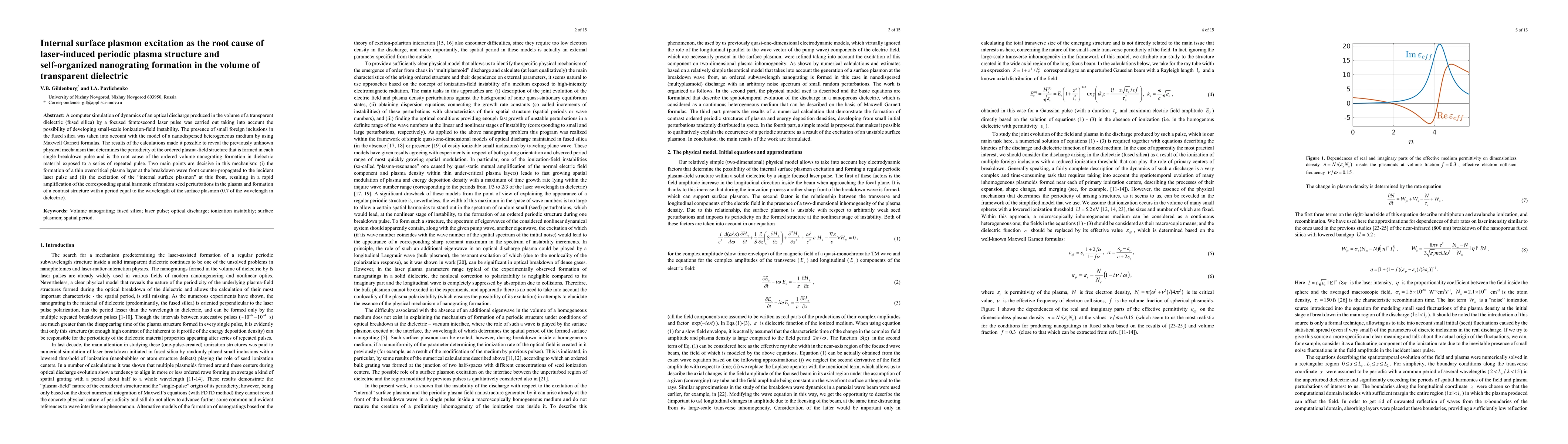 This paper identifies internal surface plasmon excitation as the key mechanism for laser-induced periodic plasma structures and self-organized nanograting formation in transparent dielectrics. The study reveals that a thin overcritical plasma layer and the excitation of internal surface plasmons at the breakdown wave front lead to the formation of ordered nanogratings.