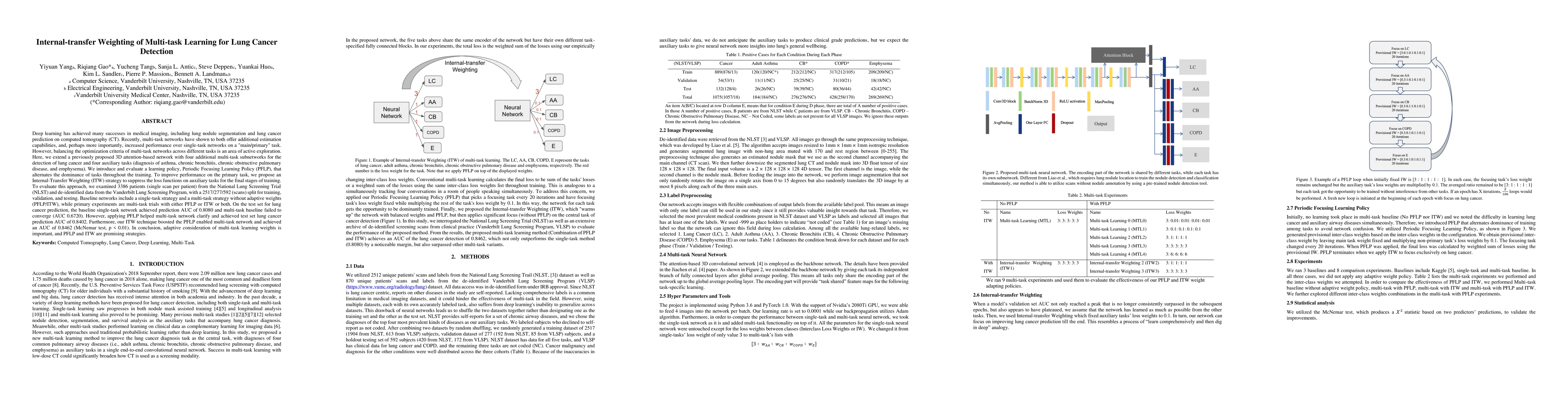 This paper proposes an Internal-Transfer Weighting (ITW) strategy and a Periodic Focusing Learning Policy (PFLP) to improve multi-task learning for lung cancer detection. The approach enhances performance over single-task networks and achieves an AUC of 0.8462 on lung cancer prediction, outperforming the baseline single-task network.