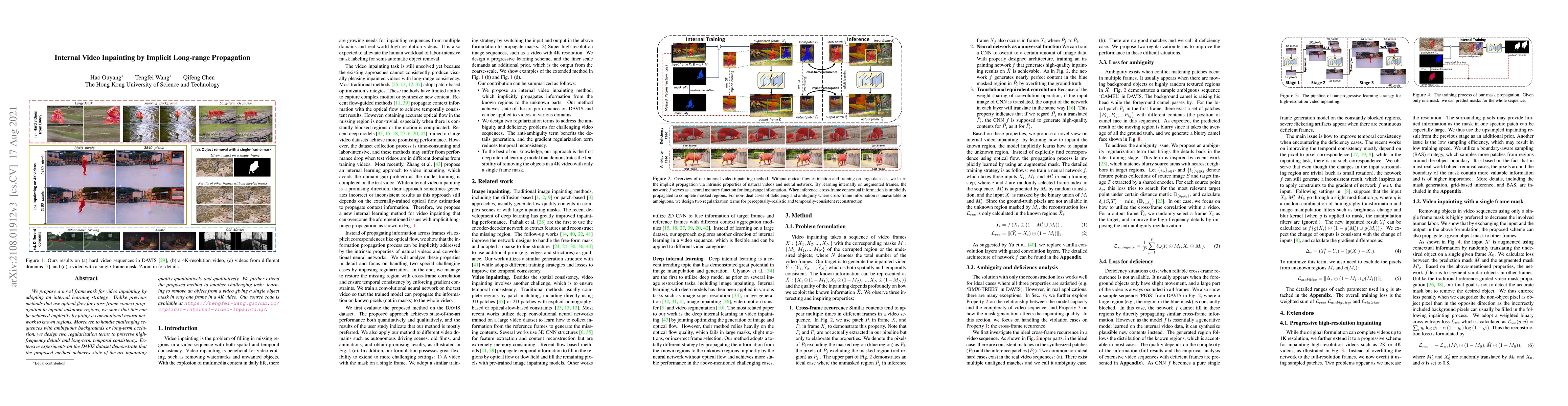 This paper introduces a novel video inpainting framework that implicitly propagates context through a convolutional neural network fitted to known regions, avoiding the use of optical flow. It employs regularization terms to maintain high-frequency details and temporal consistency, achieving state-of-the-art results on the DAVIS dataset and extending the method to object removal from videos.