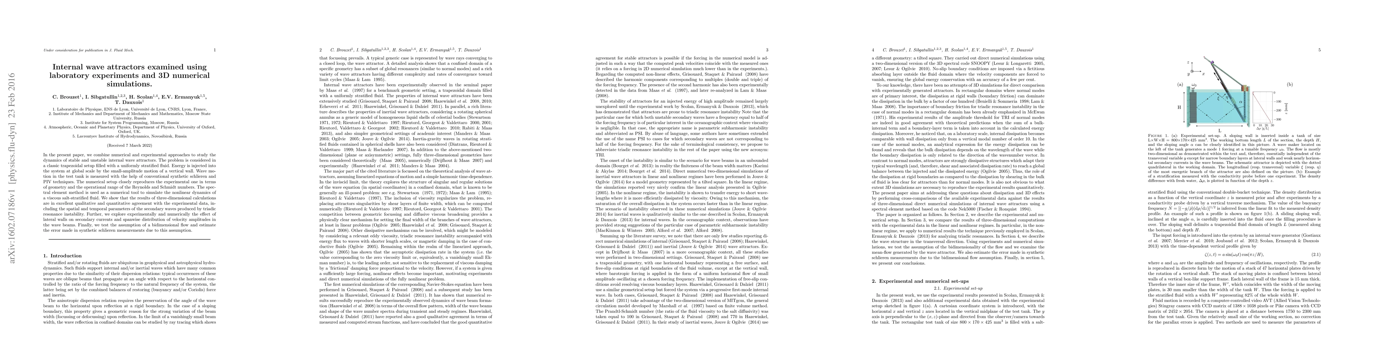 In the present paper, we combine numerical and experimental approaches to study the dynamics of stable and unstable internal wave attractors. The problem is considered in a classic trapezoidal setup filled with a uniformly stratified fluid. Energy is injected into the system at global scale by the small-amplitude motion of a vertical wall. Wave motion in the test tank is measured with the help of conventional synthetic schlieren and PIV techniques. The numerical setup closely reproduces the experimental one in terms of geometry and the operational range of the Reynolds and Schmidt numbers. The spectral element method is used as a numerical tool to simulate the nonlinear dynamics of a viscous salt-stratified fluid. We show that the results of three-dimensional calculations are in excellent qualitative and quantitative agreement with the experimental data, including the spatial and temporal parameters of the secondary waves produced by triadic resonance instability. Further, we explore experimentally and numerically the effect of lateral walls on secondary currents and spanwise distribution of velocity amplitudes in the wave beams. Finally, we test the assumption of a bidimensional flow and estimate the error made in synthetic schlieren measurements due to this assumption.