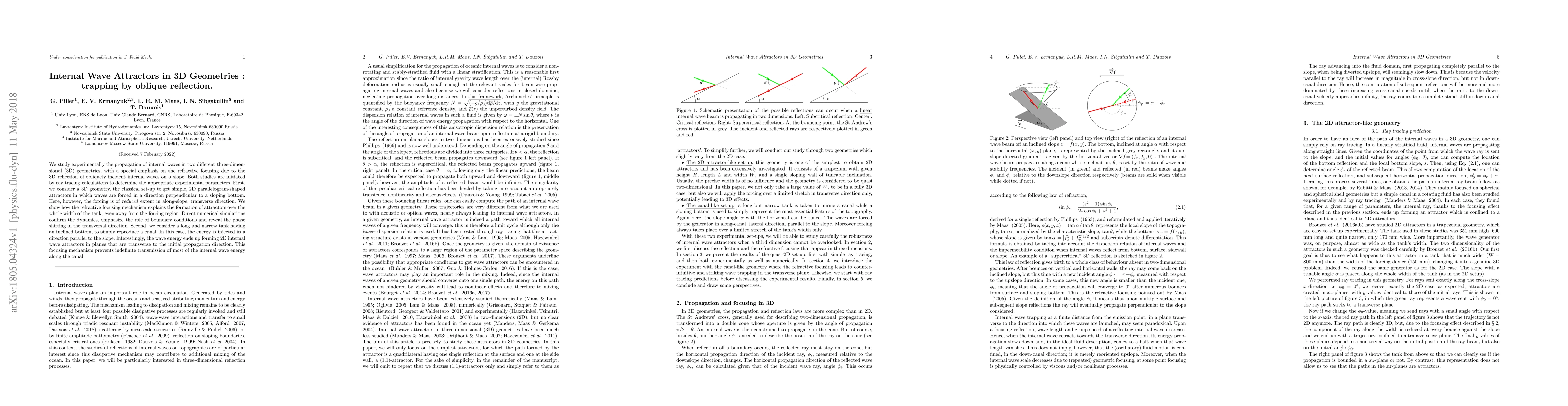 This paper experimentally investigates internal wave propagation in two distinct 3D geometries, focusing on the formation of attractors through refractive focusing due to oblique wave reflections. It highlights the role of boundary conditions and phase shifting, demonstrating that wave energy can be trapped and form transverse 2D attractors even when injected parallel to the slope.