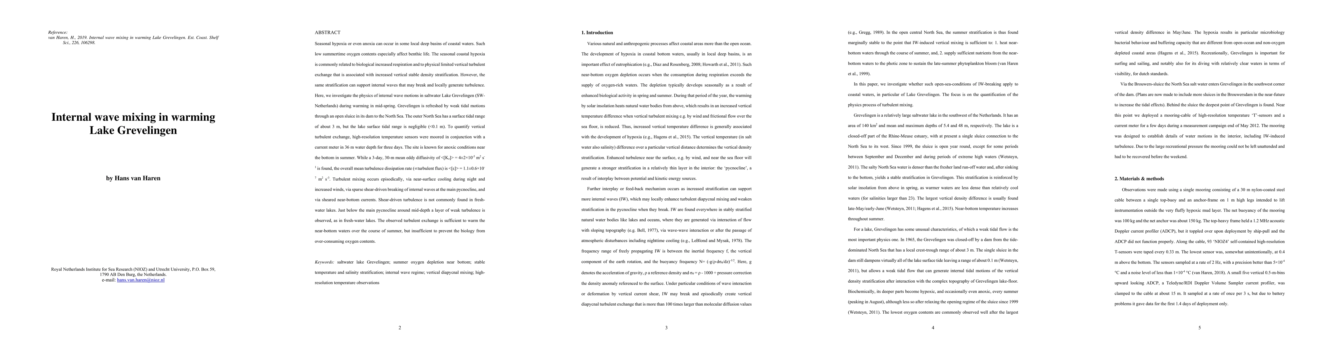 Seasonal hypoxia or even anoxia can occur in some local deep basins of coastal waters. Such low summertime oxygen contents especially affect benthic life. The seasonal coastal hypoxia is commonly related to biological increased respiration and to physical limited vertical turbulent exchange that is associated with increased vertical stable density stratification. However, the same stratification can support internal waves that may break and locally generate turbulence. Here, we investigate the physics of internal wave motions in saltwater Lake Grevelingen (SW-Netherlands) during warming in mid-spring. Grevelingen is refreshed by weak tidal motions through an open sluice in its dam to the North Sea. The outer North Sea has a surface tidal range of about 3 m, but the lake surface tidal range is negligible (<0.1 m). To quantify vertical turbulent exchange, high-resolution temperature sensors were moored in conjunction with a current meter in 36 m water depth for three days. The site is known for anoxic conditions near the bottom in summer. While a 3-day, 30-m mean eddy diffusivity of <[Kz]> = 4+/-2x10-5 m2 s-1 is found, the overall mean turbulence dissipation rate (turbulent flux) is <[epsilon]> = 1.1+/-0.6x10-7 m2 s-3. Turbulent mixing occurs episodically, via near-surface cooling during night and increased winds, via sparse shear-driven breaking of internal waves at the main pycnocline, and via sheared near-bottom currents. Shear-driven turbulence is not commonly found in fresh-water lakes. Just below the main pycnocline around mid-depth a layer of weak turbulence is observed, as in fresh-water lakes. The observed turbulent exchange is sufficient to warm the near-bottom waters over the course of summer, but insufficient to prevent the biology from over-consuming oxygen contents.