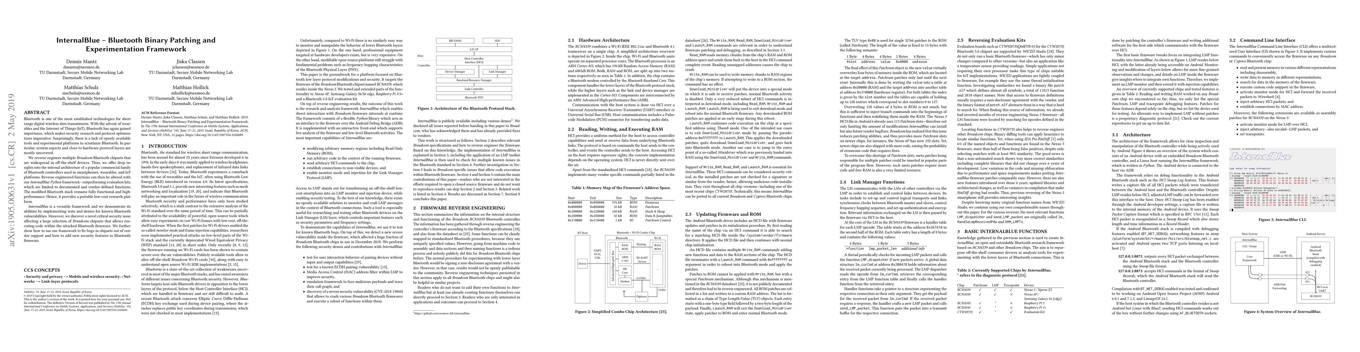 InternalBlue is a Python framework for Bluetooth binary patching, enabling deep reverse engineering and experimentation on Broadcom chipsets used in smartphones and IoT devices. It uncovers critical security vulnerabilities and allows for the addition of new security features, offering a low-cost, high-performance research platform.