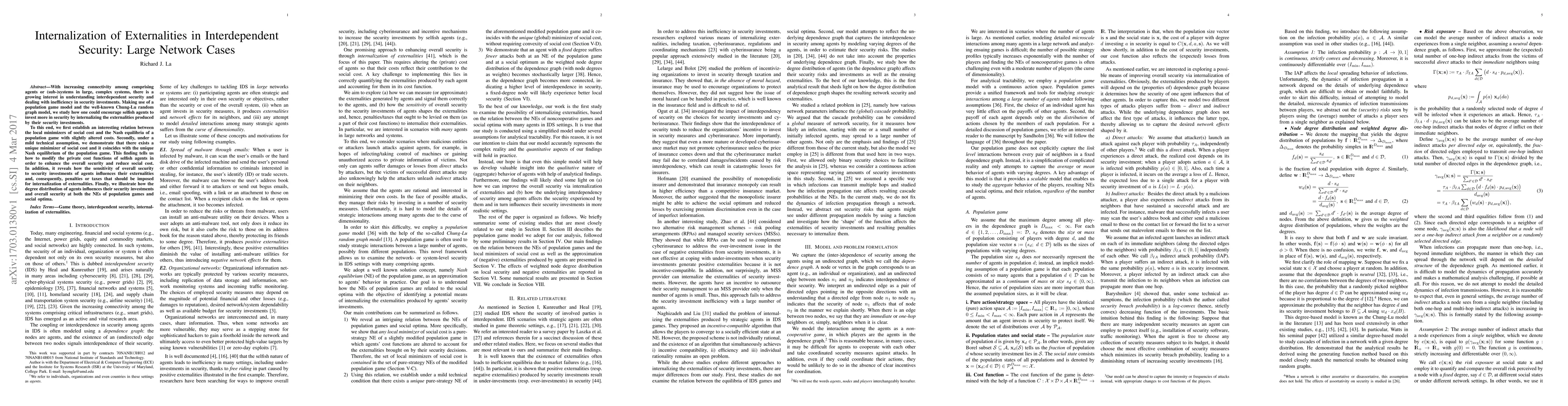 This paper explores interdependent security in large, complex systems using a population game model and Chung-Lu random graph model. It demonstrates how modifying agents' private cost functions can internalize externalities, leading to a unique Nash equilibrium that minimizes social cost and enhances overall security.