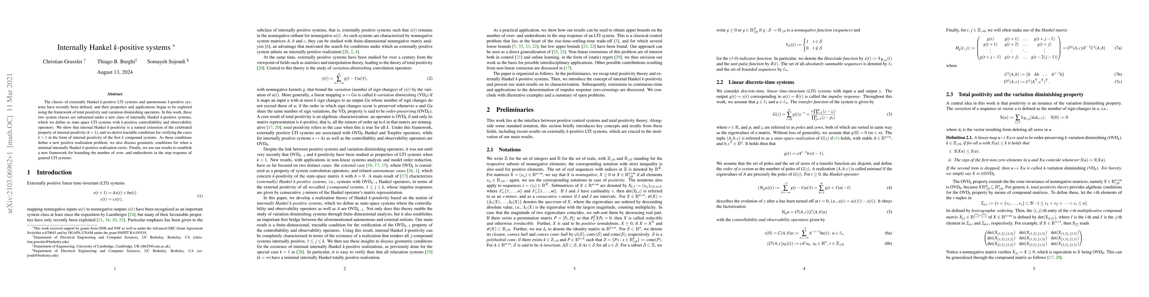 This paper introduces a new class of internally Hankel $k$-positive systems, expanding on previous definitions of externally and autonomously positive systems, and provides conditions for verifying internal positivity for $k>1$, as well as implications for bounding the number of over- and undershoots in LTI system step responses.