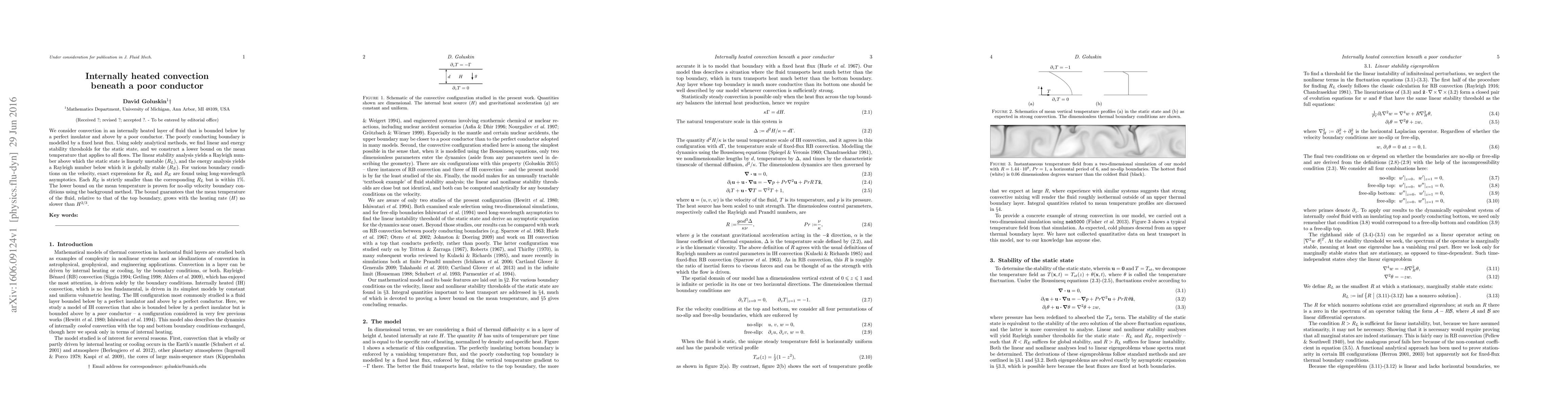 This paper analytically investigates convection in an internally heated fluid layer with a poorly conducting upper boundary, determining linear and energy stability thresholds. It finds that the static state is linearly unstable above a certain Rayleigh number ($R_L$) and globally stable below another ($R_E$), with $R_E$ within 1% of $R_L$. It also proves a lower bound on the mean temperature growth rate, showing it scales as $H^{2/3}$.