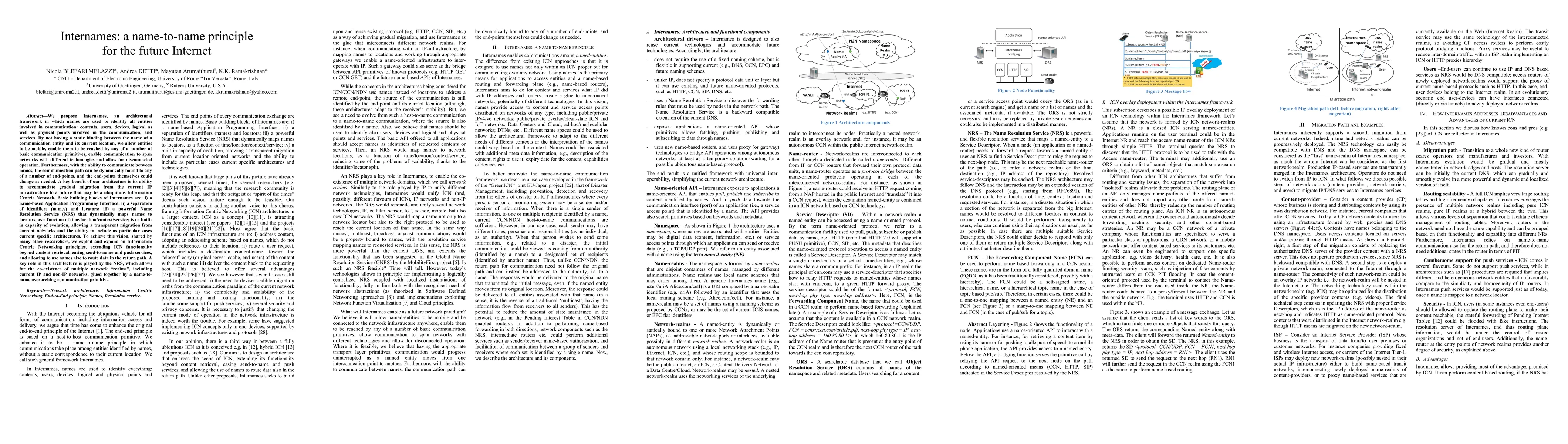Internames proposes a new architectural framework for the future Internet, utilizing names to identify all communication entities, promoting mobility, multi-technology network spanning, and disconnected operation. It introduces a name-based API, separates identifiers and locators, and employs a dynamic Name Resolution Service for seamless migration from current IP infrastructure to a future Information Centric Network. The Name Resolution Service also enables co-existence of multiple network realms, including IP and non-IP networks.