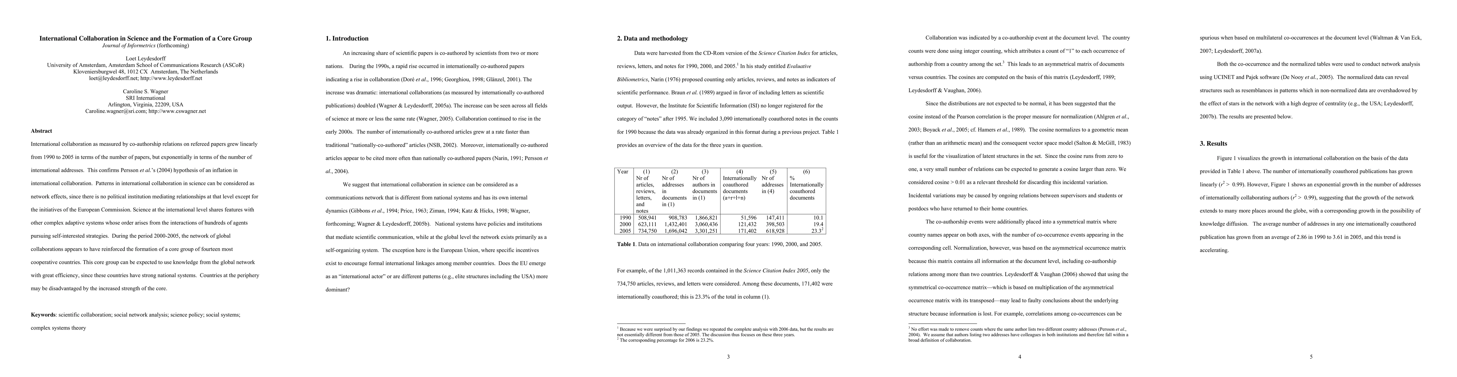 This paper examines the growth of international scientific collaboration from 1990 to 2005, noting a linear increase in the number of papers but an exponential rise in international addresses, confirming an inflation in collaboration. It highlights the formation of a core group of fourteen highly cooperative countries, which may benefit more from the global network due to their strong national systems.
