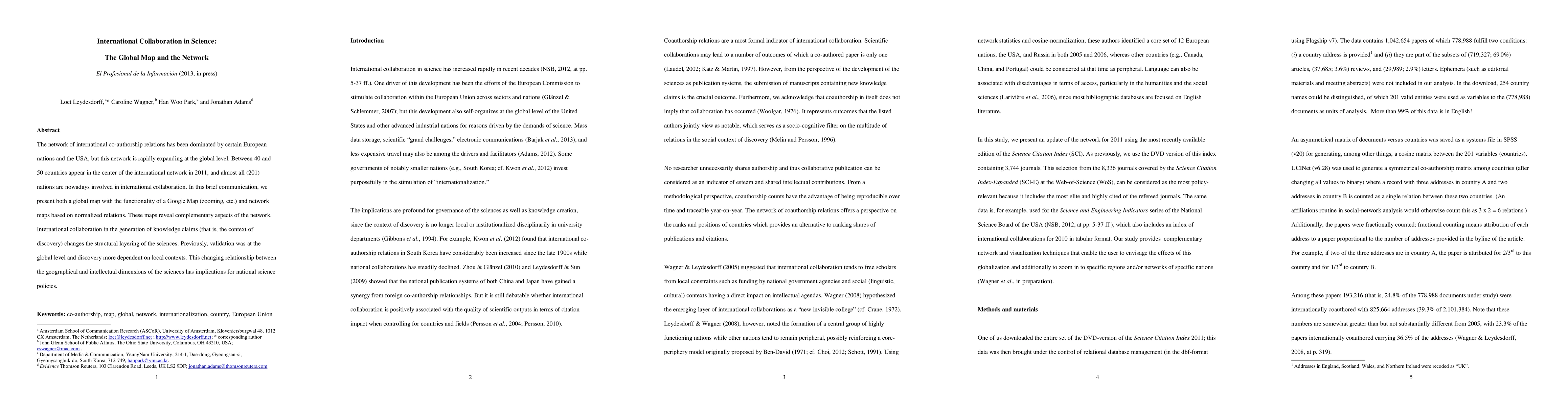 A comprehensive analysis of international scientific collaboration was conducted using co-authorship data from Thomson Reuters.