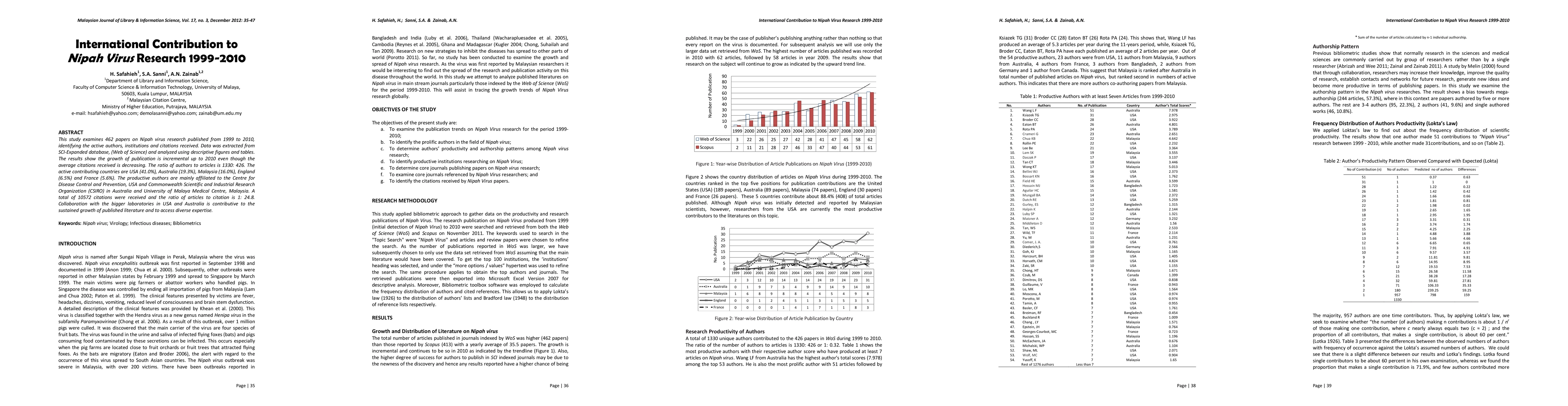 This study examines 462 papers on Nipah virus research published from 1999 to 2010, identifying the active authors, institutions and citations received. Data was extracted from SCI-Expanded database, (Web of Science) and analyzed using descriptive figures and tables. The results show the growth of publication is incremental up to 2010 even though the average citations received is decreasing. The ratio of authors to articles is 1330: 426. The active contributing countries are USA (41.0%), Australia (19.3%), Malaysia (16.0%), England (6.5%) and France (5.6%). The productive authors are mainly affiliated to the Centre for Disease Control and Prevention, USA and Commonwealth Scientific and Industrial Research Organization (CSIRO) in Australia and University of Malaya Medical Centre, Malaysia. A total of 10572 citations were received and the ratio of articles to citation is 1: 24.8. Collaboration with the bigger laboratories in USA and Australia is contributive to the sustained growth of published literature and to access diverse expertise.