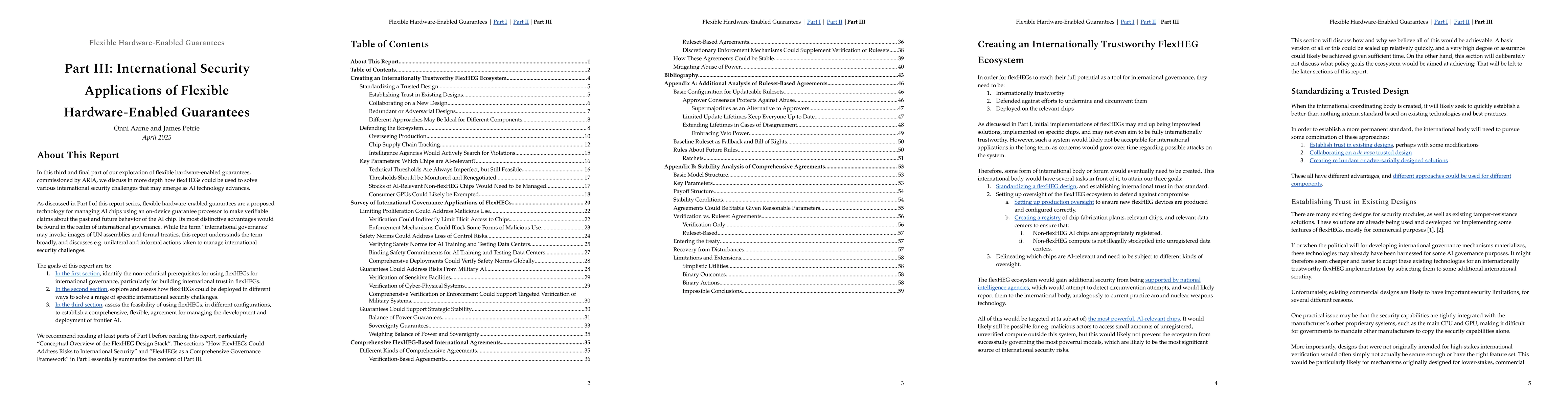 As AI capabilities advance rapidly, flexible hardware-enabled guarantees (flexHEGs) offer opportunities to address international security challenges through comprehensive governance frameworks. This report examines how flexHEGs could enable internationally trustworthy AI governance by establishing standardized designs, robust ecosystem defenses, and clear operational parameters for AI-relevant chips. We analyze four critical international security applications: limiting proliferation to address malicious use, implementing safety norms to prevent loss of control, managing risks from military AI systems, and supporting strategic stability through balance-of-power mechanisms while respecting national sovereignty. The report explores both targeted deployments for specific high-risk facilities and comprehensive deployments covering all AI-relevant compute. We examine two primary governance models: verification-based agreements that enable transparent compliance monitoring, and ruleset-based agreements that automatically enforce international rules through cryptographically-signed updates. Through game-theoretic analysis, we demonstrate that comprehensive flexHEG agreements could remain stable under reasonable assumptions about state preferences and catastrophic risks. The report addresses critical implementation challenges including technical thresholds for AI-relevant chips, management of existing non-flexHEG hardware, and safeguards against abuse of governance power. While requiring significant international coordination, flexHEGs could provide a technical foundation for managing AI risks at the scale and speed necessary to address emerging threats to international security and stability.