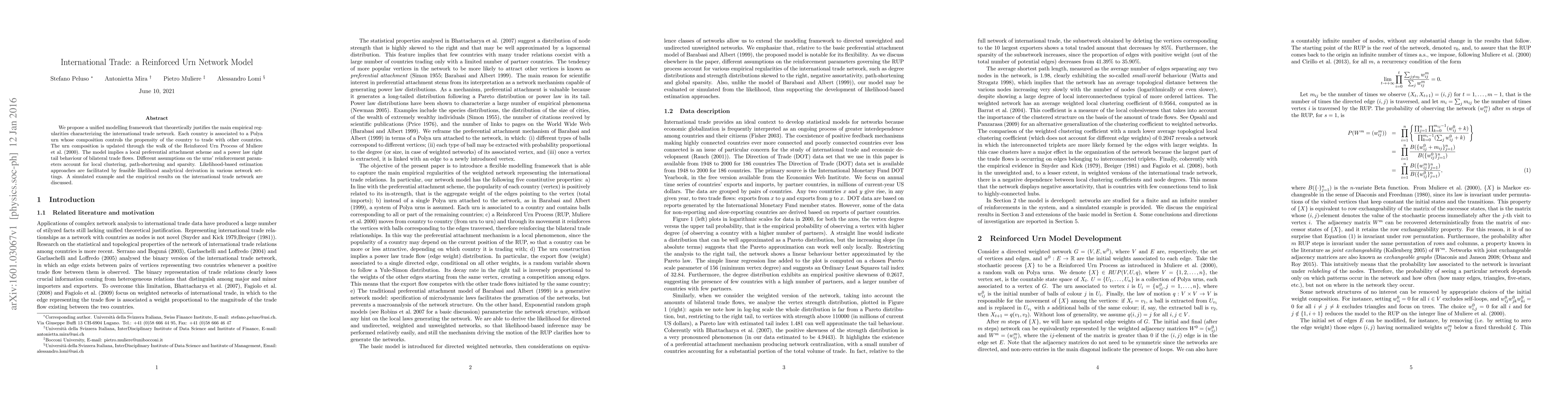 We propose a unified modelling framework that theoretically justifies the main empirical regularities characterizing the international trade network. Each country is associated to a Polya urn whose composition controls the propensity of the country to trade with other countries. The urn composition is updated through the walk of the Reinforced Urn Process of Muliere et al. (2000). The model implies a local preferential attachment scheme and a power law right tail behaviour of bilateral trade flows. Different assumptions on the urns' reinforcement parameters account for local clustering, path-shortening and sparsity. Likelihood-based estimation approaches are facilitated by feasible likelihood analytical derivation in various network settings. A simulated example and the empirical results on the international trade network are discussed.