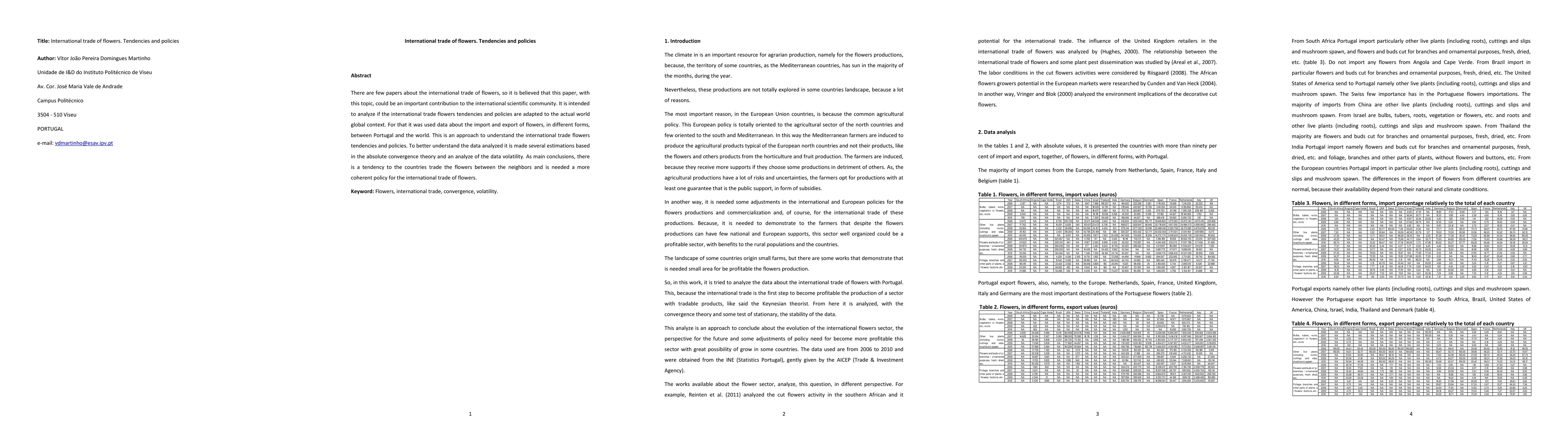 There are few papers about the international trade of flowers, so it is believed that this paper, with this topic, could be an important contribution to the international scientific community. It is intended to analyze if the international trade flowers tendencies and policies are adapted to the actual world global context. For that it was used data about the import and export of flowers, in different forms, between Portugal and the world. This is an approach to understand the international trade flowers tendencies and policies. To better understand the data analyzed it is made several estimations based in the absolute convergence theory and an analyze of the data volatility. As main conclusions, there is a tendency to the countries trade the flowers between the neighbors and is needed a more coherent policy for the international trade of flowers.