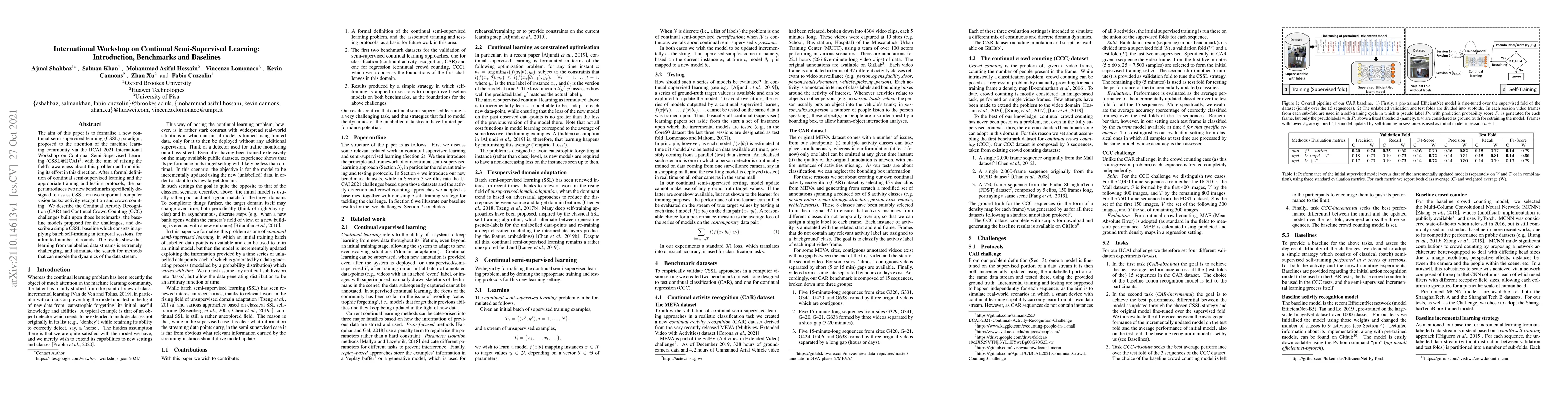 The aim of this paper is to formalize a new continual semi-supervised learning (CSSL) paradigm, proposed to the attention of the machine learning community via the IJCAI 2021 International Workshop on Continual Semi-Supervised Learning (CSSL-IJCAI), with the aim of raising field awareness about this problem and mobilizing its effort in this direction. After a formal definition of continual semi-supervised learning and the appropriate training and testing protocols, the paper introduces two new benchmarks specifically designed to assess CSSL on two important computer vision tasks: activity recognition and crowd counting. We describe the Continual Activity Recognition (CAR) and Continual Crowd Counting (CCC) challenges built upon those benchmarks, the baseline models proposed for the challenges, and describe a simple CSSL baseline which consists in applying batch self-training in temporal sessions, for a limited number of rounds. The results show that learning from unlabelled data streams is extremely challenging, and stimulate the search for methods that can encode the dynamics of the data stream.