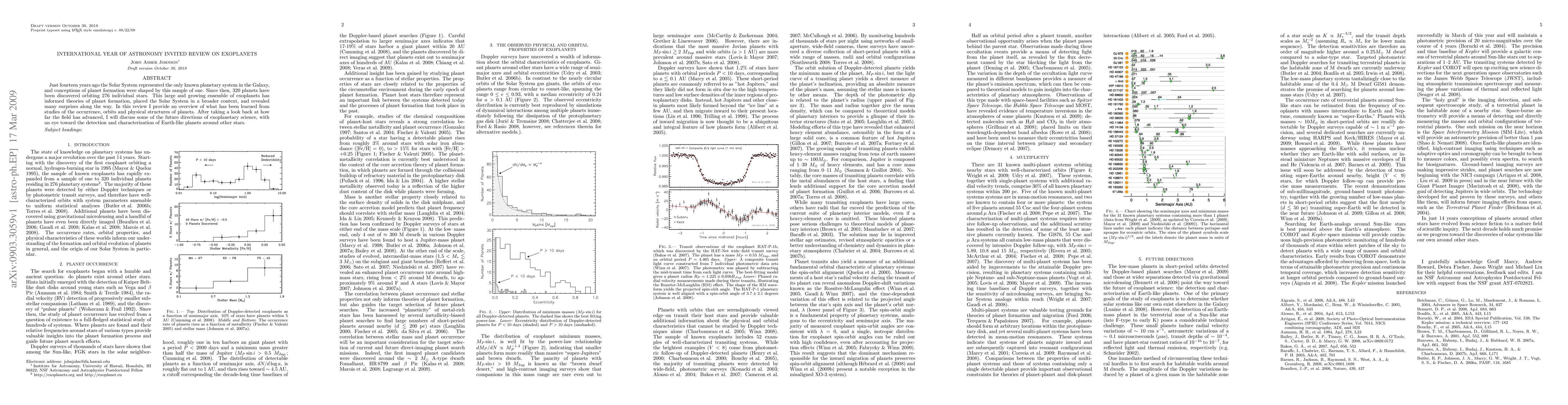 Just fourteen years ago the Solar System represented the only known planetary system in the Galaxy, and conceptions of planet formation were shaped by this sample of one. Since then, 320 planets have been discovered orbiting 276 individual stars. This large and growing ensemble of exoplanets has informed theories of planet formation, placed the Solar System in a broader context, and revealed many surprises along the way. In this review I provide an overview of what has been learned from studies of the occurrence, orbits and physical structures of planets. After taking a look back at how far the field has advanced, I will discuss some of the future directions of exoplanetary science, with an eye toward the detection and characterization of Earth-like planets around other stars.