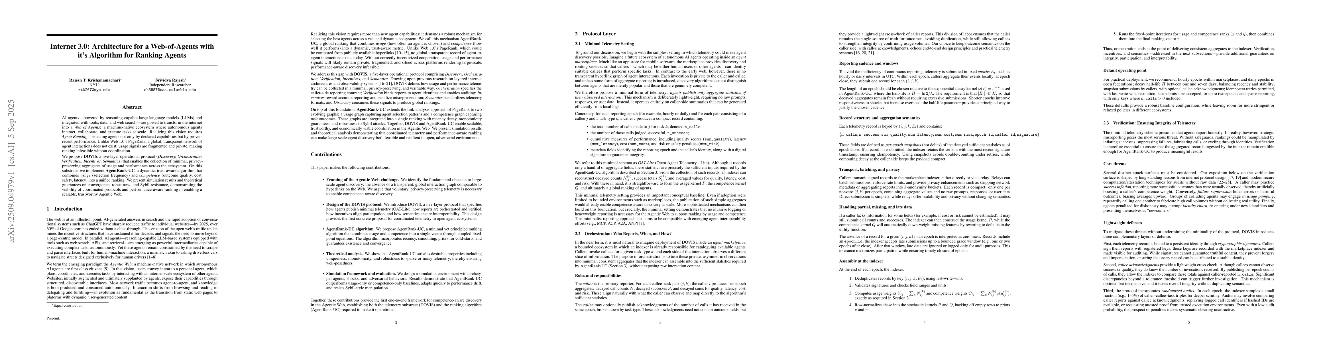 AI agents -- powered by reasoning-capable large language models (LLMs) and integrated with tools, data, and web search -- are poised to transform the internet into a \emph{Web of Agents}: a machine-native ecosystem where autonomous agents interact, collaborate, and execute tasks at scale. Realizing this vision requires \emph{Agent Ranking} -- selecting agents not only by declared capabilities but by proven, recent performance. Unlike Web~1.0's PageRank, a global, transparent network of agent interactions does not exist; usage signals are fragmented and private, making ranking infeasible without coordination. We propose \textbf{DOVIS}, a five-layer operational protocol (\emph{Discovery, Orchestration, Verification, Incentives, Semantics}) that enables the collection of minimal, privacy-preserving aggregates of usage and performance across the ecosystem. On this substrate, we implement \textbf{AgentRank-UC}, a dynamic, trust-aware algorithm that combines \emph{usage} (selection frequency) and \emph{competence} (outcome quality, cost, safety, latency) into a unified ranking. We present simulation results and theoretical guarantees on convergence, robustness, and Sybil resistance, demonstrating the viability of coordinated protocols and performance-aware ranking in enabling a scalable, trustworthy Agentic Web.